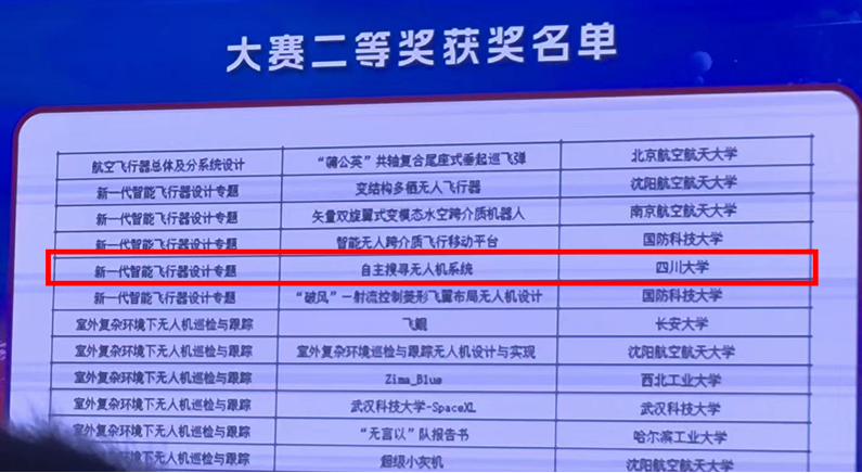 2023年8月23日,“新动航空杯”第九届中国研究生未来飞行器创新大赛在沈阳航空航天大学举行。四川大学yl23411永利(集团)有限公司官网SC-AR团队(主要成员:戚奇汉,林海,李道文,张湄婕)在指导老师杨鑫松教授的带领下,参赛作品“自主搜寻无人机系统”获得全国二等奖的好成绩。