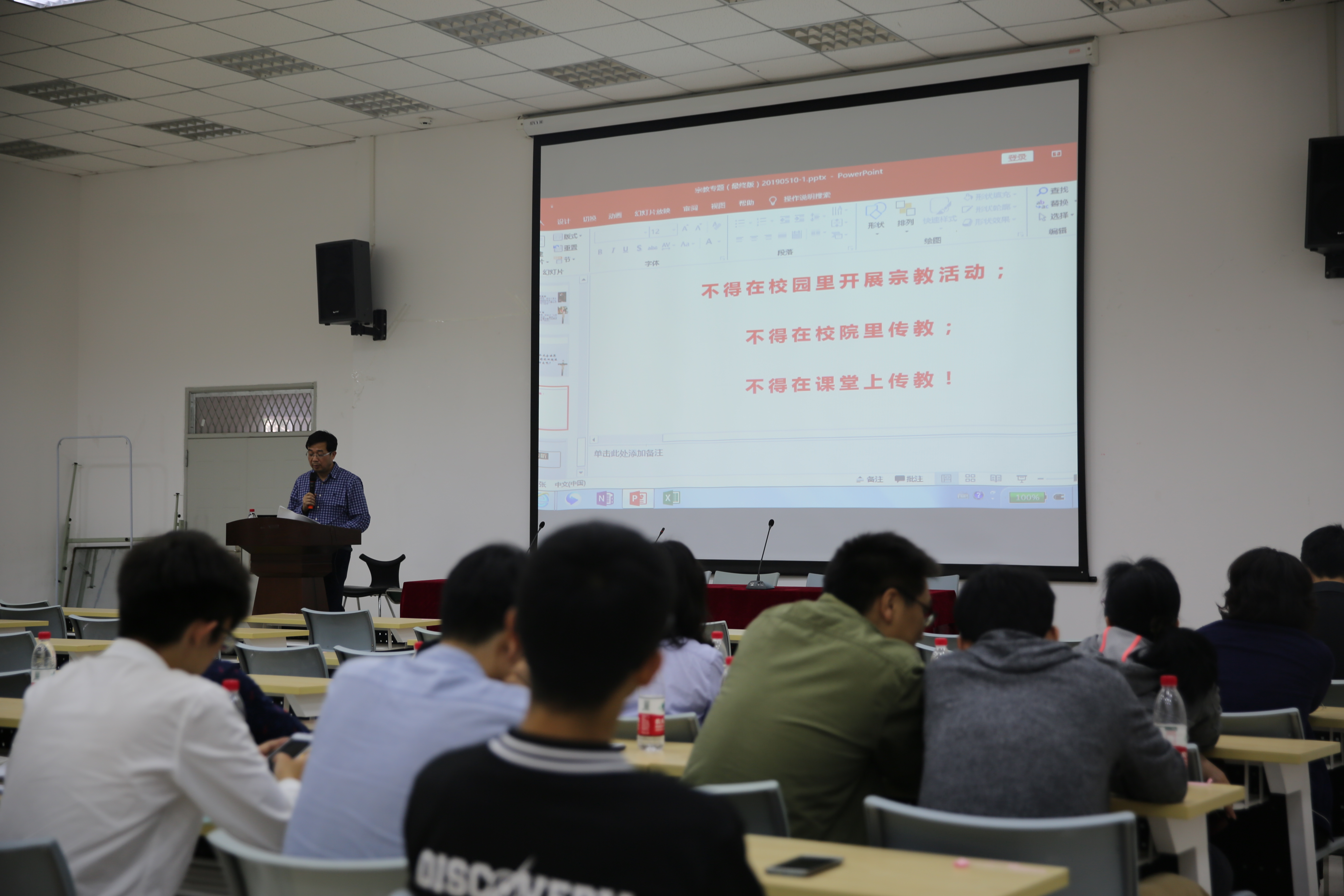 最后,邰明松书记强调作为高校教师要严格遵守国家的宗教政策,严守不得在校园里开展宗教活动、不得在校院里传教、不得在课堂上传教的底线。