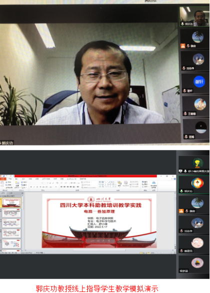 在教学实践模块培训部分,学院聘请了教学经验丰富、学生评教优秀的郭庆功教授承担。在线上平台每位学员不限题目及形式就一个“问题”或“理论”进行5分钟的教学模拟演示,郭教授线上对学员进行点评、指导,并亲切、热情地传授课堂教学经验。郭教授评价学员基本都准备认真,讲解明白,大多数PPT教学内容设计有重点、条理清楚。