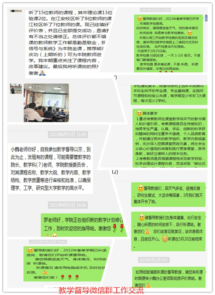 教学督导积极开展教学检查、课堂听课等相关保障教学质量的工作,全面掌握本科教学情况。督导听课工作有计划有安排务求实效。考虑疫情反复原因,教学督导组通常在微信工作群布置和交流相关工作。学院要求,课堂听课检查着重考察教师在课堂教学各环节的教书育人和价值引领,言传身教,并对授课教师的教学内容、教学态度、教学水平、教材选用、教学质量等进行评价,检查学生的学习、出勤、纪律情况。督导听课后及时跟任课老师交流,针对听课中发现的问题提出相应的整改意见和建议,填报听课评议。