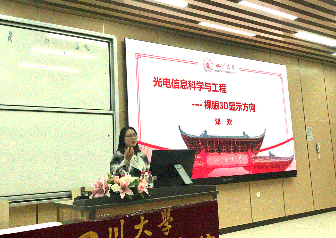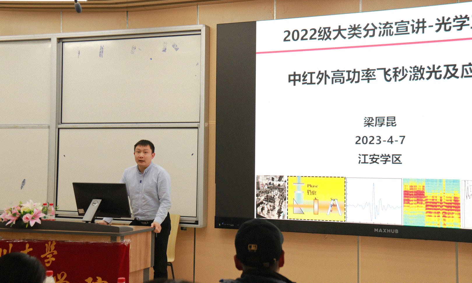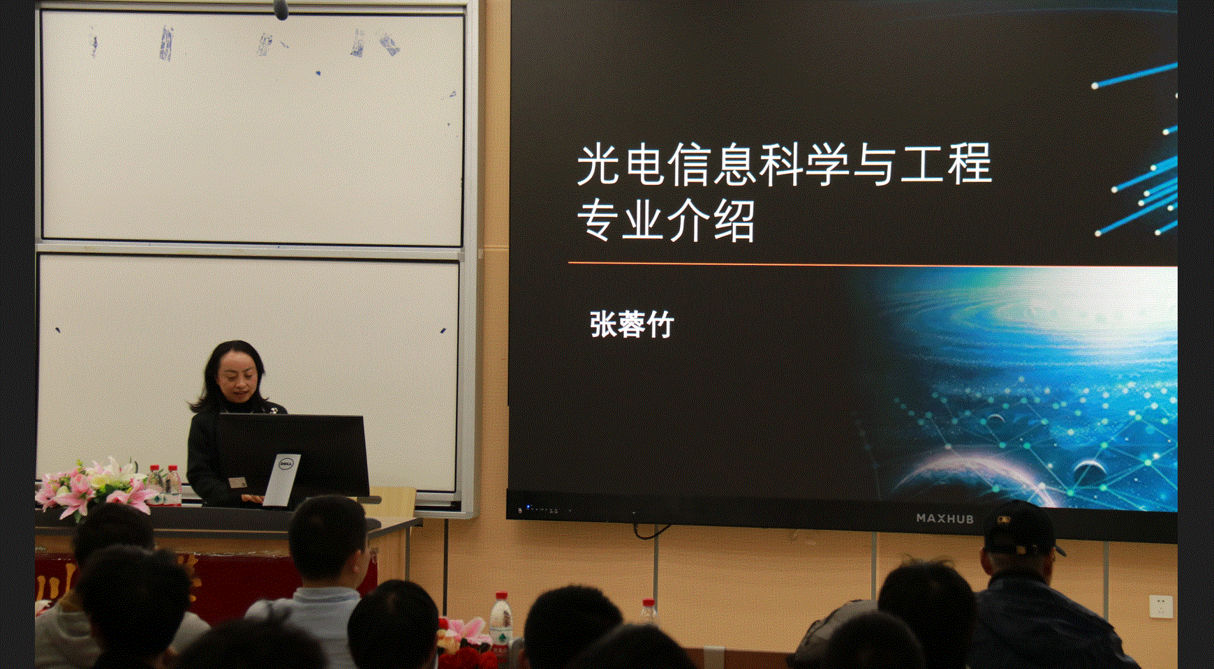 接着,由学院光学工程系组成的宣讲团队进行光电信息科学与工程专业的介绍。首先是张蓉竹老师向同学们重点展示了本专业要学什么、学完之后能在哪些领域干什么等几个学生重点关注的问题进行了详细的介绍,接着由梁厚昆老师,申俊飞老师和邓欢老师分别以实验室的研究方向及相关实验进展做了有趣的讲解,为同学们了解本专业奠定了更好的基础。