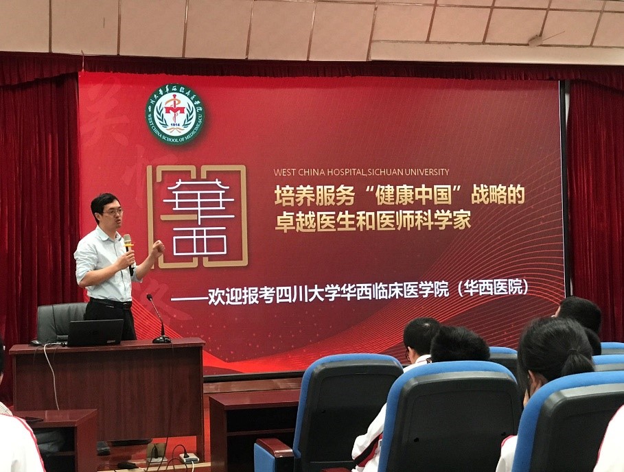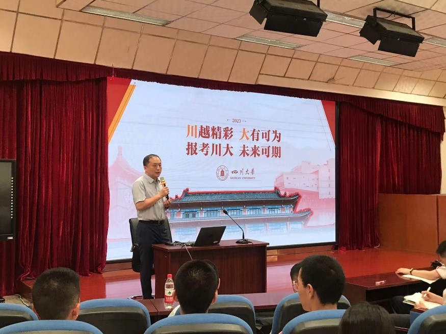 为扩大四川大学的知名度和影响力,深度挖掘并吸引优质生源,由yl23411永利(集团)有限公司官网副院长雷印杰教授带队,化学学院副院长郑成斌教授、华西临床医学院王涵博士组成招生宣讲团,于2023年4月18日下午赴四川师范大学附属中学开展招生宣传工作,近200名高三年级学生参加了本次宣讲活动。