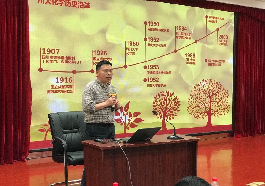 接着,化学学院副院长郑成斌教授进行宣讲,他主要从化学学院的历史沿革、师资力量、科研平台、本科教育以及拔尖、强基计划进行了详细介绍,特别重点介绍了学院的强基和拔尖计划,鼓励更多以家国天下为使命担当同学报考。郑教授的宣讲为同学们解读了化学学院的人才培养机制,使同学们对川大的化学学院有了不一样的认识。