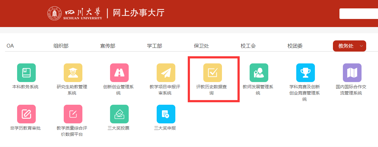 Ⅱ.进入网上办事大厅后,在单位菜单栏处选择“教务处”——“评教历史数据查询”图标。