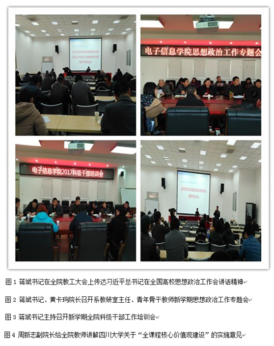 3、积极学习国家和学校重要教育方针政策,加强教师思想政治素养,立德树人。2月27日-3月3日,学院先后组织召开了领导班子、科级干部、系教研室主任、全院教工大会学习传达了会议上的重要讲习近平总书记在全国高校思想政治工作会讲话精神、教育部党风廉政建设视频会精神、四川大学关于“全课程核心价值观建设”的实施意见。
