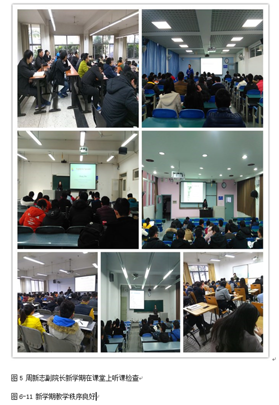 总之,在学院高度重视下,从开学第一周检查情况看,并结合学院领导、系教研室主任在江安、望江校区听课检查情况,教师都按时到岗,积极营造良好课堂氛围,师生精神面貌良好,教学及管理工作有序进行,没有发生任何教学事故,学院领导、系教研室主任深入课堂听课检查9次。