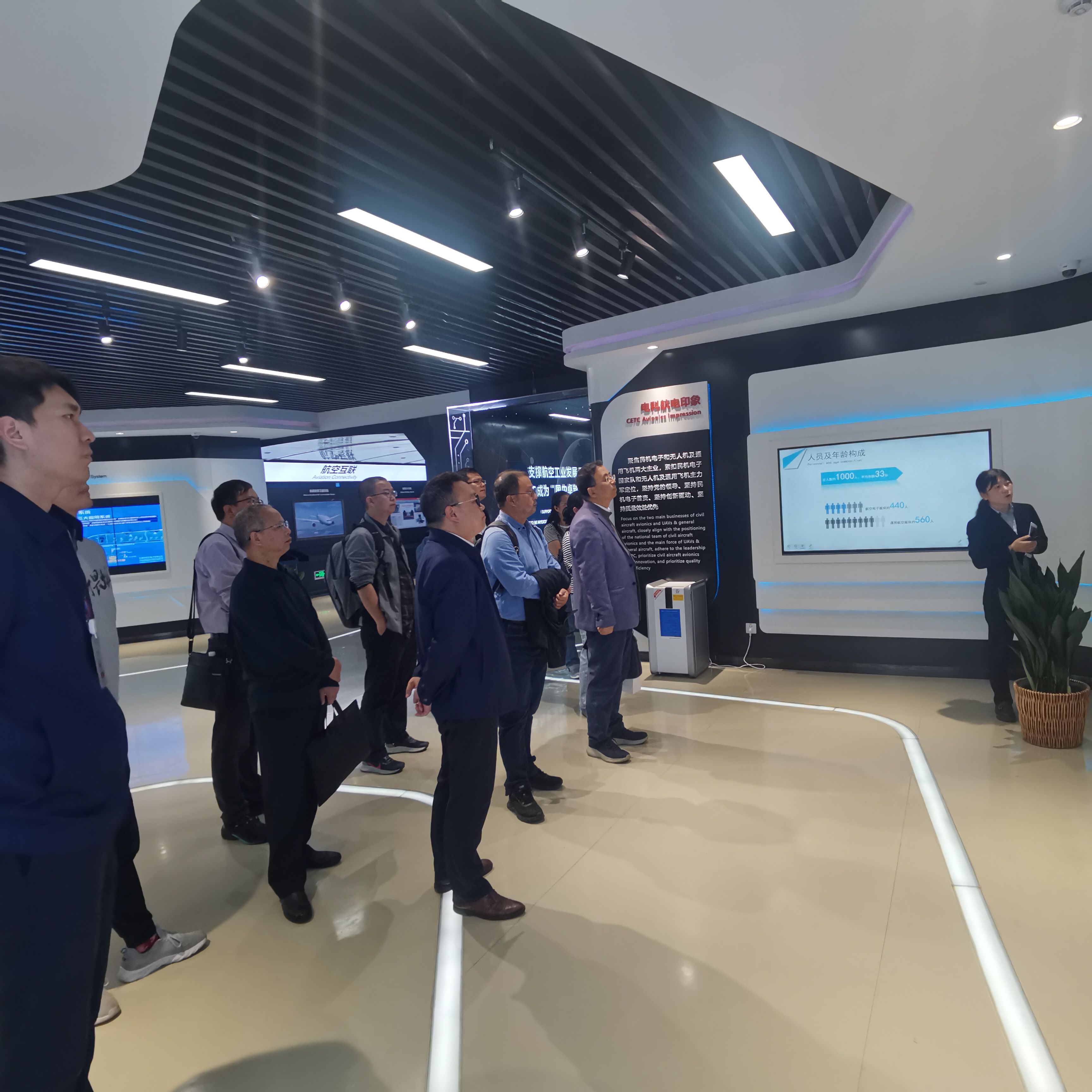 我院教师一行首先参观了电科航电展厅,了解了航空发展的历史。随后,又前往参观了通信导航实验室、客舱娱乐系统实验室和空地互联实验室,对航空发展有了更加深入的认识和理解。