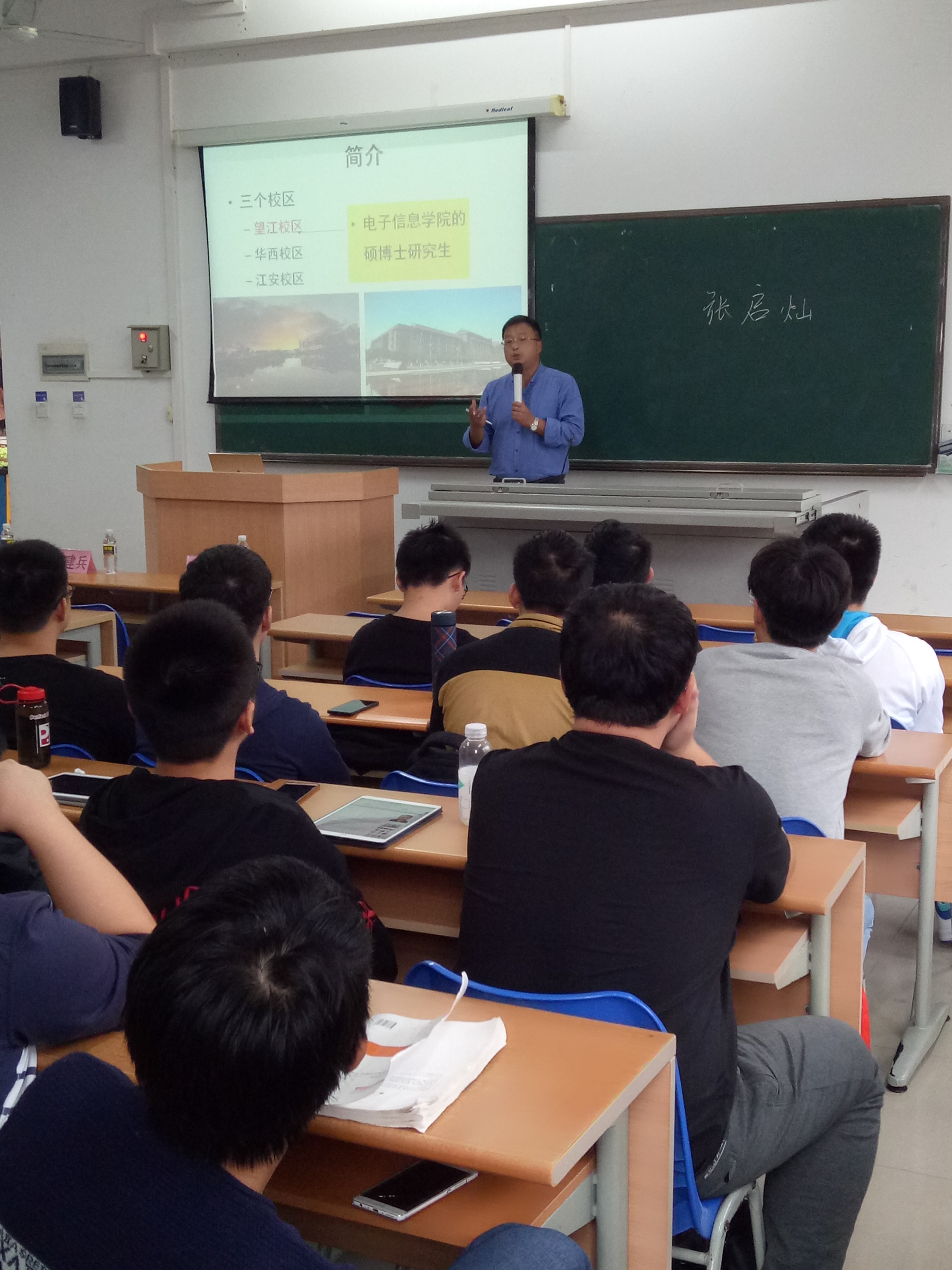 2017年12月13日下午15:00-16:00张院长一行在海南大学机电学院与该院翁绍捷院长、唐荣年副院长、马庆芬副院长及相关老师,进行了科研、教学、人才培养、学科建设等多方面的工作交流。下午16:00-18:00,张院长对机电学院和信息学院60多名大三学生进行了我院研究生招生宣讲,赖老师还对我们学院2018年暑期夏令营进行了介绍。宣讲结束之后部分学生表现出了极大的兴趣,并踊跃提问,老师们对同学们提出的问题一一做了详细的解答。