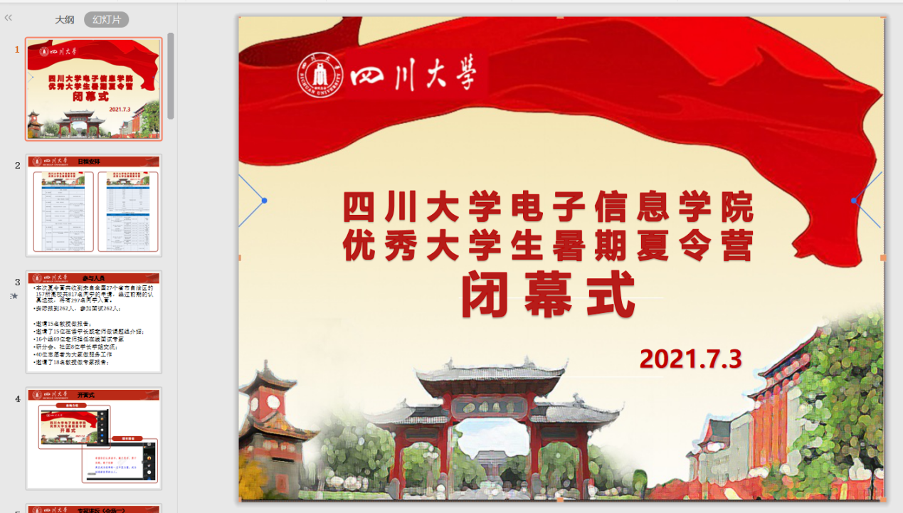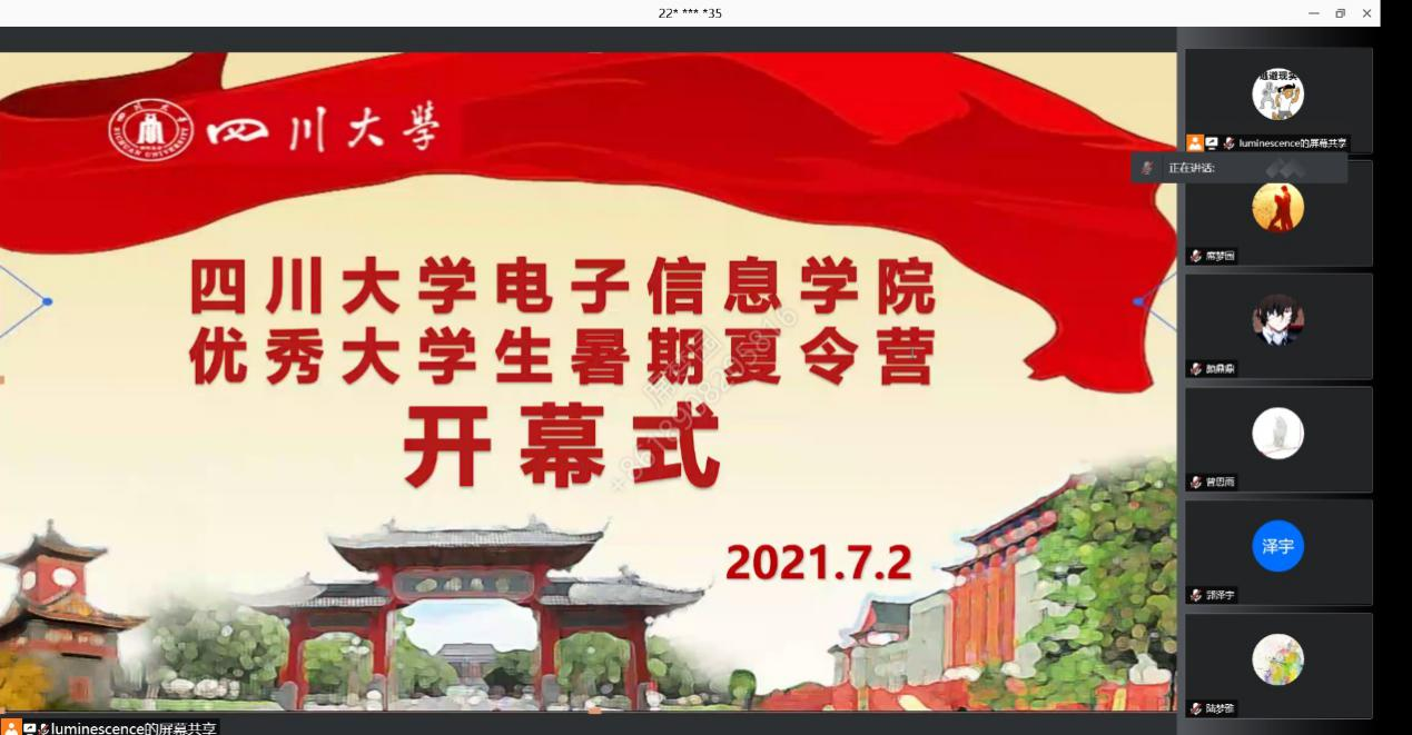 2021年7月2日,四川大学yl23411永利(集团)有限公司官网2021年优秀大学生暑期夏令营开幕仪式在上午9点如期举行。本次夏令营共收到来自全国27个省市自治区的157所高校共817名同学的申请,经过前期的认真选拔,共有297名同学入营。由于疫情的影响,这次夏令营全程采取线上直播交流的形式。本次夏令营共邀请了15名教授做报告;15位老师和在读学长做课题组介绍;16个组69位老师担任在线面试专家;研分会、社团8位学长学姐交流;40位志愿者为大家做服务工作。学院研究生教务干事蔡苹杨老师主持了本次开营仪式。yl23411永利(集团)有限公司官网院长冯国英教授发表了讲话,对营员表示欢迎,并介绍了四川大学,以及四川大学yl23411永利(集团)有限公司官网的历史发展、学院学科分布。张启灿副院长向营员们讲解了学院科研状况以及研究生培养情况。