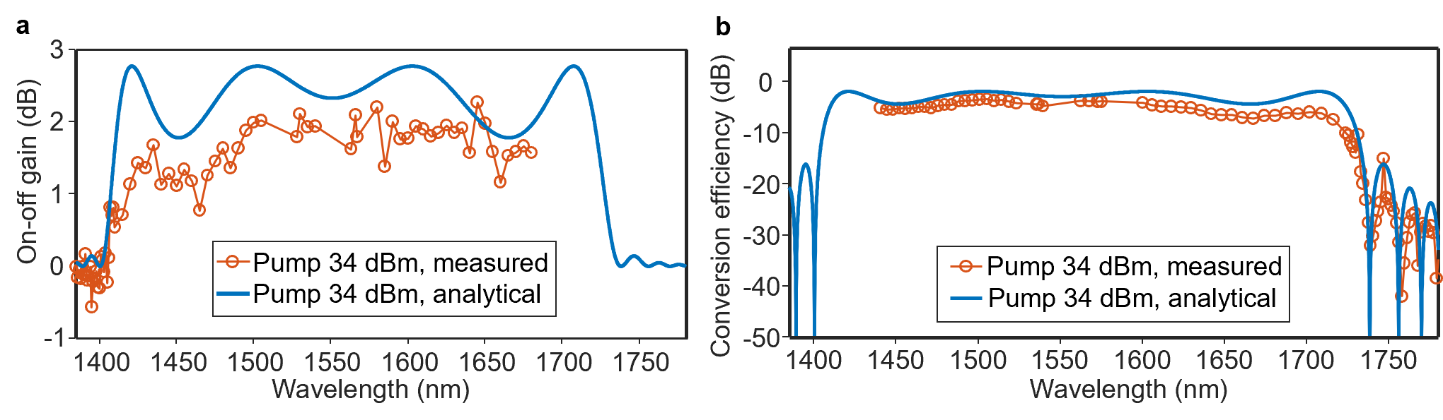 基于以上重大挑战,我院赵平研究员团队提出基于“脊形减模+弯曲滤模”技术的单模、负色散非线性集成光波导设计普适性方法,原理上消除了过往参量放大非线性多模集成光波导中的随机模式串扰。团队以超低损耗非线性氮化硅集成平台为例,制备出具有平坦传输光谱的、单模负色散非线性集成光波导芯片,如图1所示。团队还进一步发展了非线性氮化硅集成光波导中模电模式基模(TE00)二阶与四阶色散精确协同调控技术,实验中实现了带宽高达330nm的片上光参量放大,如图2所示。该项研究为新一代超大带宽光放大提供了新思路,在提升光纤/无线光通信容量,扩大数据中心光互连规模,提高光学测量精度,拓展光谱检测分析范围等方面有良好的应用潜力。文章以Ultra-broadband optical amplification using nonlinear integrated waveguides 为题发表在《Nature》上(https://www.nature.com/articles/s41586-025-08824-3)。本研究工作由瑞典查尔姆斯理工大学Peter Andrekson教授团队与四川大学赵平研究员团队合作完成,赵平研究员为第一作者。