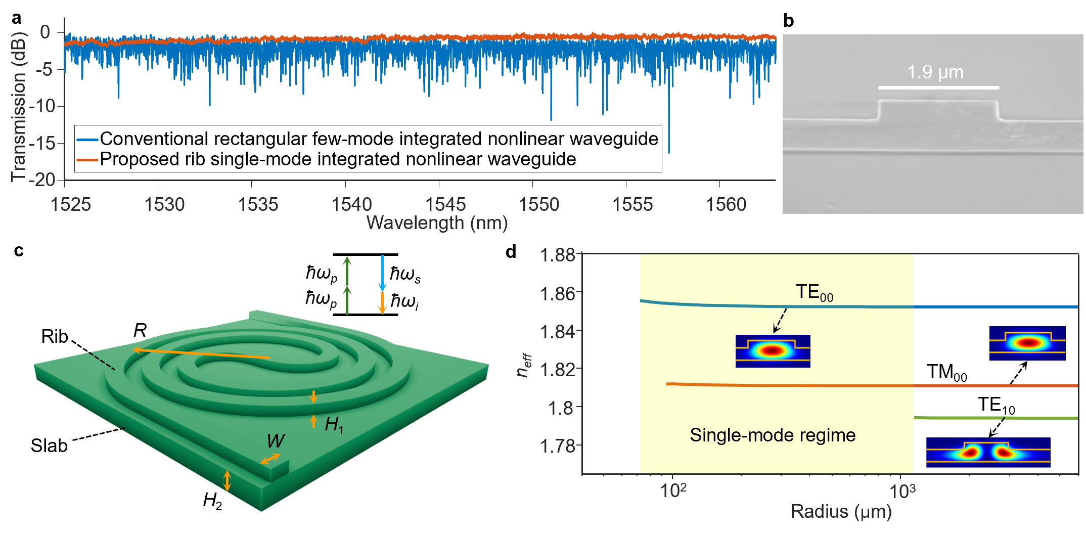 作为一种基本的光学元件,光放大器在通信、传感、测量、光谱分析、成像等众多光学系统中被广泛使用。四波混频集成波导光参量放大器,具有克服受激辐射光放大器带宽和噪声系数物理限制的特点与微型化的优势,引起了广泛的研究兴趣。如何消除色散管理非线性集成光波导中的多模串扰,是片上光参量放大的长期难题。此外,通过多阶色散调控取得超大带宽光参量放大,也是人们一直追求的研究目标。