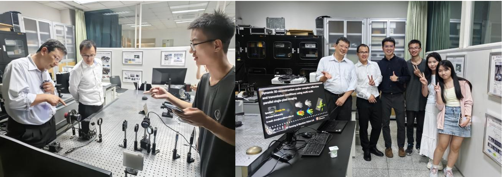 2024年9月26日下午, Motoharu FUJIGAKI教授和姜伟博士参观了三维传感与机器视觉实验室,老师同学们向他们介绍了实验室的最新工作进展和成果,这些成果不仅包括了理论模型的创新,还有实际应用的案例,充分展示了实验室团队的科研实力和创新精神。双方进行了深入的交流与探讨,FUJIGAKI教授提出了一系列专业的问题,实验室的成员们逐一进行了解答,同时分享了他们在研究过程中遇到的挑战和解决方案,以及对科研工作的独到见解。