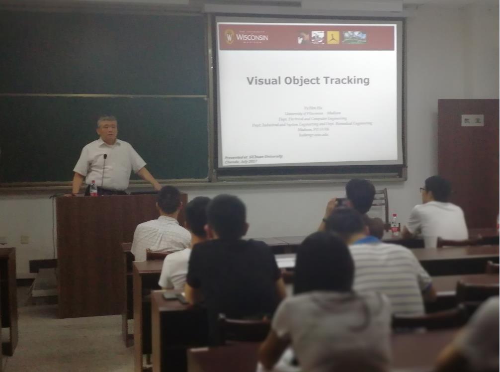 2017年7月3日,国际电气与电子工程师协会会士、美国威斯康星大学麦迪逊分校电气和计算机工程系的胡玉衡教授受邀到访我院,并做了一场以“Visual Object Tracking”题为的精彩学术讲座。我院的王君副教授主持了本次报告会,学校相关专业以及对视觉对象追踪技术感兴趣的师生积极参与了报告和学术讨论。