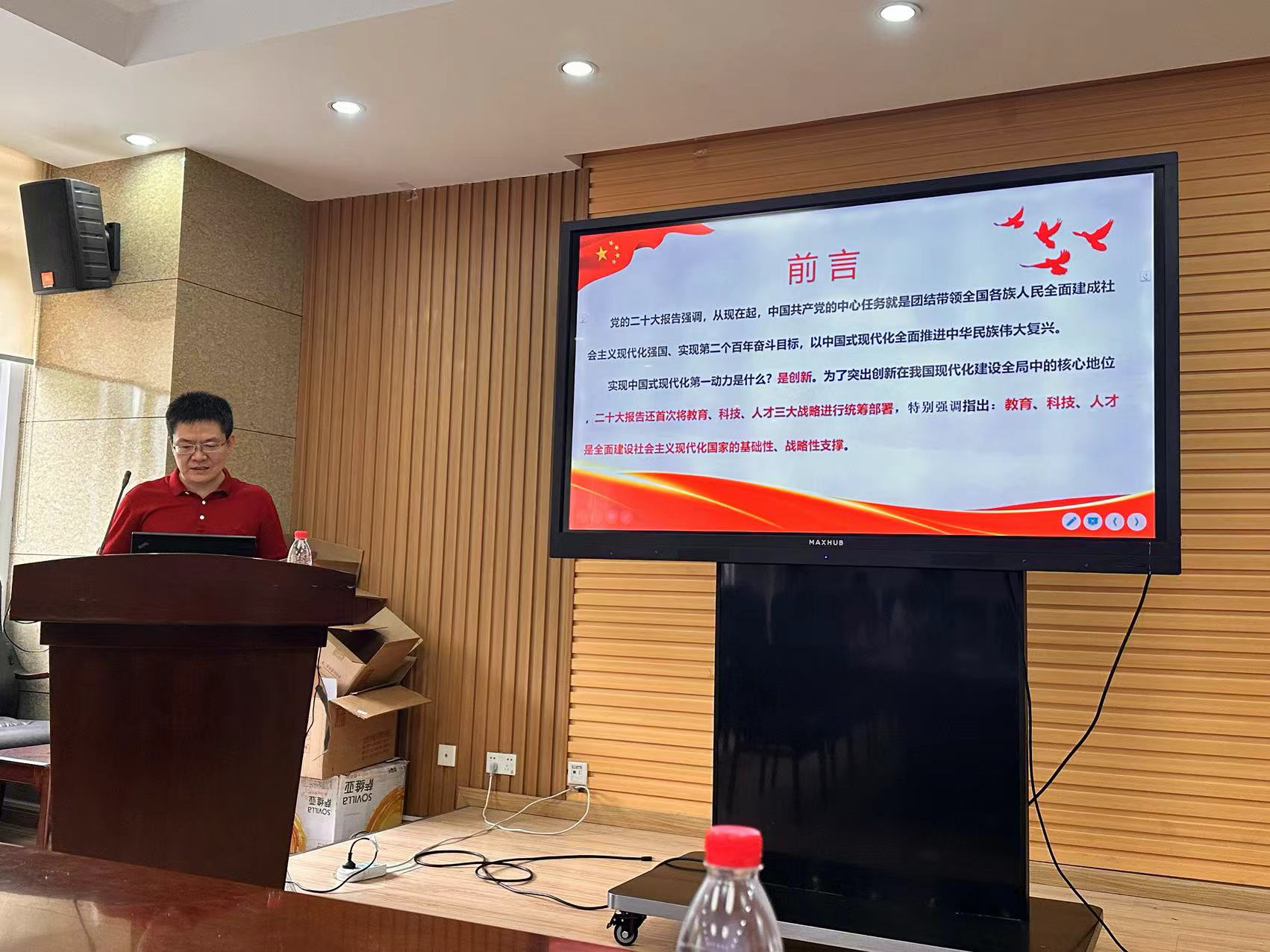 党课上,卿粼波介绍到:“党的二十大报告强调,从现在起,中国共产党的中心任务就是团结带领全国各族人民全面建成社会主义现代化强国、实现第二个百年奋斗目标,以中国式现代化全面推进中华民族伟大复兴。实现中国式现代化第一动力是什么?是创新。为了突出创新在我国现代化建设全局中的核心地位,二十大报告还首次将教育、科技、人才三大战略进行统筹部署,特别强调指出:教育、科技、人才是全面建设社会主义现代化国家的基础性、战略性支撑。”