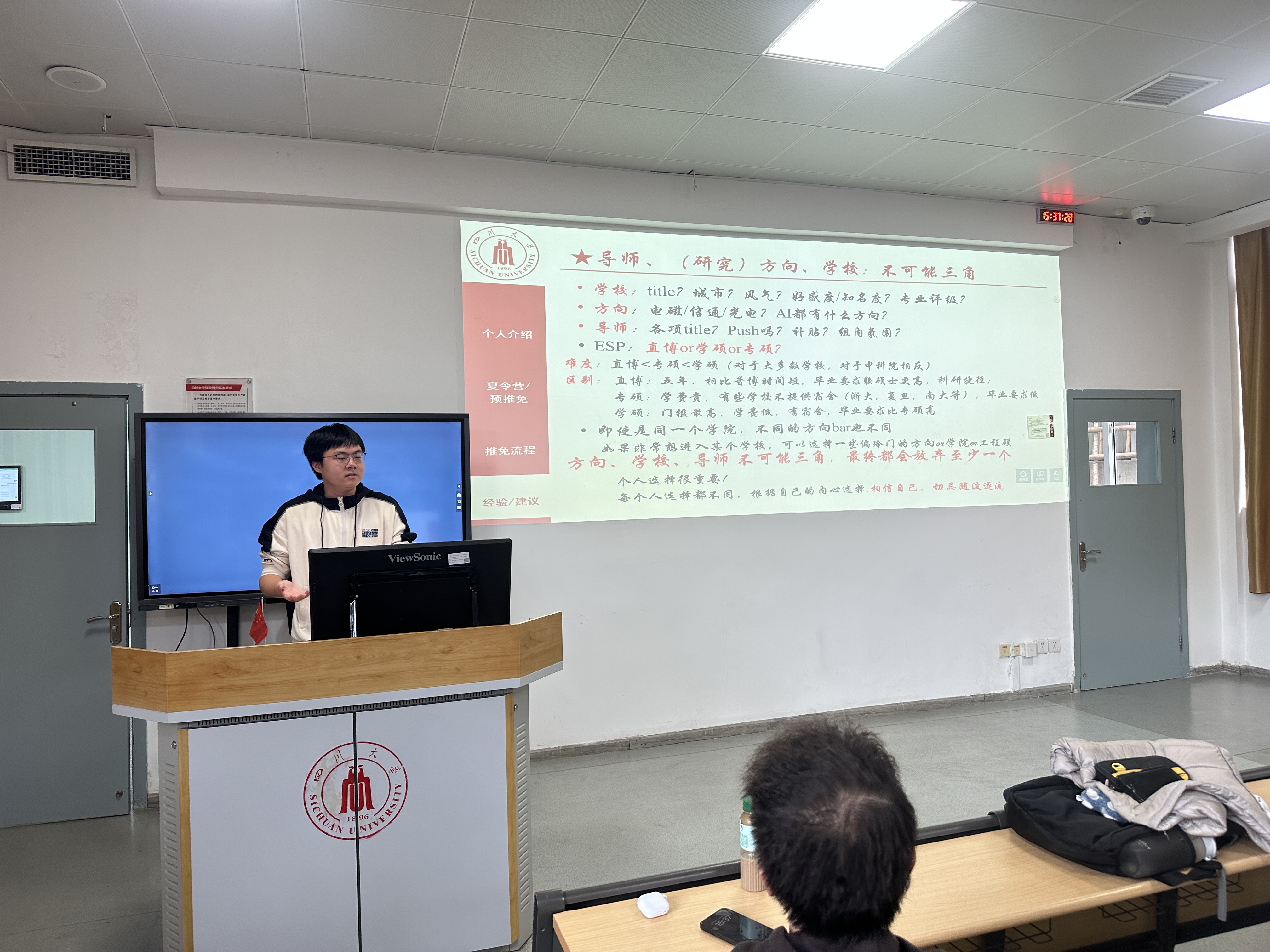 次日的分享热度不减,四位学长各展所长,带来更具针对性的保研干货。黄九学长从自身定位出发,为不同排名区间的学子提供了精准的院校投递建议,并详解了南大、电科等院校的面试流程。丁子恒学长聚焦通信工程专业特色,分享了电子设计竞赛备赛与科研项目开展的经验,梳理了IC方向的学习路径与导师选择技巧。谢灏学长系统讲解了套磁信撰写、简历打磨、科研项目深化的实用方法,强调了论文与竞赛成果的积累价值。胡瑞学长则结合前沿 AI 方向的保研经历,分享了专业基础复习、热点课题追踪的技巧。