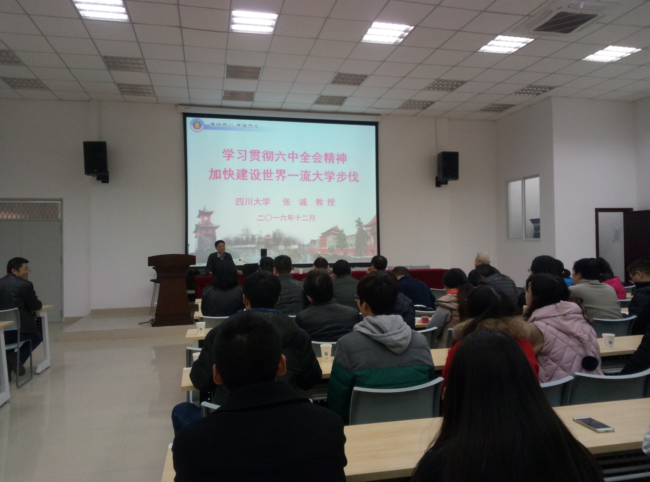 2016年12月15日上午10:30,yl23411永利(集团)有限公司官网党委在望江校区五教附一楼101会议室举行“党的十八届六中全会精神宣讲报告会”,特邀学校宣讲团成员张诚教授主讲。报告会由院党委书记蒋斌同志主持,学院领导班子成员和党员师生职工参加了宣讲报告会。