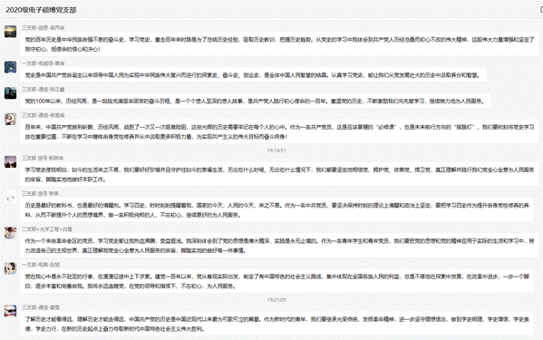 会后党员同志们积极交流学习心得。党的100年以来,历经风雨,是一段段充满艰辛困苦的奋斗历程、是一个个感人至深的感人故事,是共产党人践行初心使命的一百年。历史是最好的教科书,也是最好的清醒剂。学习四史,时时刻刻提醒着我,国家的今天,人民的今天,来之不易。作为一名中共党员,要坚决保持时刻的理论上清醒和政治上坚定,要把学习四史作为提升自身党性修养的养料,从而不断提升个人的思想境界,做一名积极纯粹的人,不忘初心,继续更好的为人民服务。