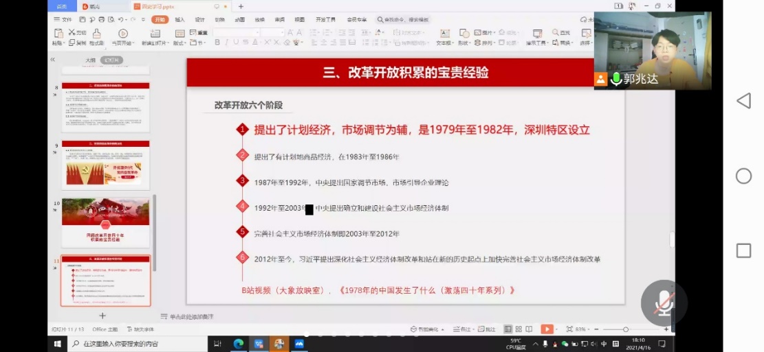 此次活动的形式不只是局限于了解深圳特区的发展历程,而是采取PPT分享、视频观看、各同学线下调研的方式。达到对深圳特区政策了解,最重要的是对改革开放史深刻了解,实事求是的传承与宣扬。PPT由3班班长郭兆达制作并分享,通过回顾党的改革开放精神,由浅入深,引导同学们了解、热爱、拥护党的改革开放精神和政策。视频观看是《1978年中国发生了什么,四十年激荡系列》B站高播放量纪录片,是贴合同学们观看兴趣和年龄段的优秀红色影片。同学们的参与积极性非常高,线上都能感受到同学们们的激情澎湃,常进行连麦互动分享改革开放给身边带来的变化。