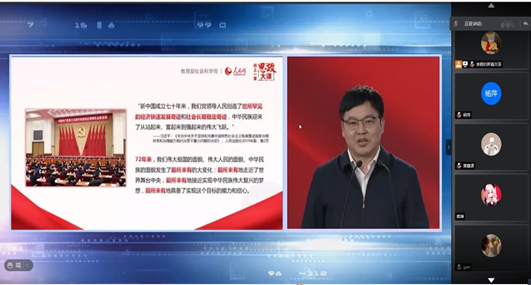 此次线上活动主要由天津师范大学马克思主义学院副教授、中国近现代史纲要教研室副主任王雪超老师,上海师范大学马克思主义学院院长、教授张志丹老师,复旦大学马克思主义学院副教授、中国近现代史纲要研究室主任肖存良老师为我们授课。王雪超老师从民族独立新形象——由丧权辱国到屹立东方、国家统一新局面——由四分五裂到团结统一、人民解放新面貌——由受人压迫到成为主人三个方面为我们进行讲解,最后以没有共产党,就没有新中国作为结语,王雪超老师表示,希望同学们不负青春,不负韶华,不负时代,铭记新中国历史,走好人生道路,为实现中华民族伟大复兴贡献聪明才智。张志丹老师给我们讲的主题是新中国经济发展的奇迹,主要从新中国经济发展的奇迹“奇”在何处及新中国经济发展“密码”为何进行讲解,张志丹老师最后表示,在两个大局交叠互动的背景下,我们面临着各种机遇和挑战,但是我们有理由相信,只要始终坚持党的领导,牢牢把握中国经济奇迹发展的密码,继续发挥我们的制度优势,改革不停顿,开放不止步,发展不休止,方向不偏离,就一定能实现社会主义现代化和中华民族伟大复兴。肖存良老师讲的主题是新中国国家制度建设的历程和伟大成就,主要从社会主义革命和建设时期国家制度建设的历程与成就、改革开放新时期国家制度建设的历程与成就、中国特色社会主义新时代国家制度建设的历程与成就三方面进行讲解,最后肖存良老师表示,历史给我们的启示是国家制度建设始终要坚持党的领导,国家制度建设要始终坚持马克思主义基本原理与中国实际相结合,制度优势需要转化为治理效果。