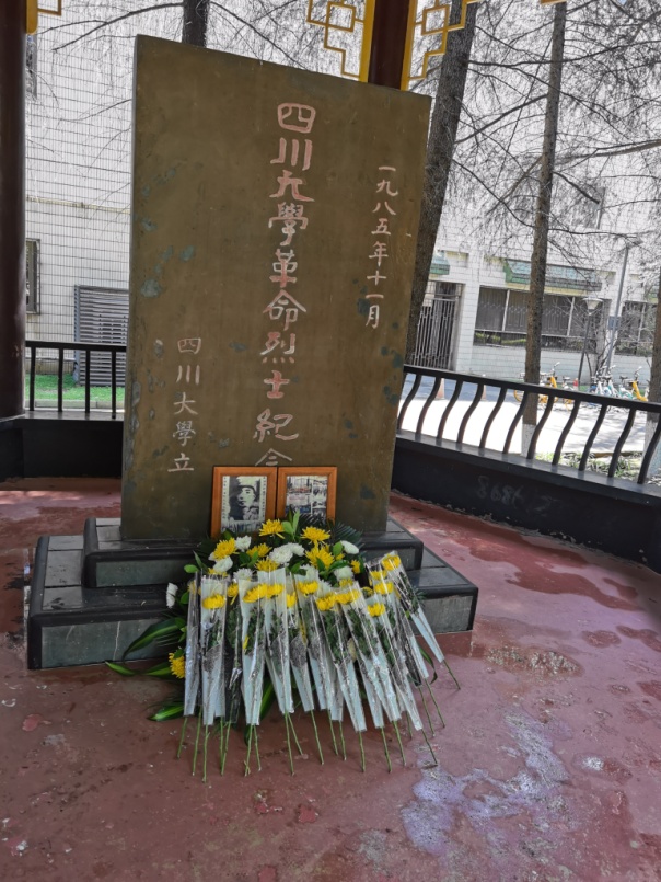 活动伊始,主持人首先介绍四川大学革命英雄纪念碑。四川大学革命先烈纪念碑是为建立新中国而英勇牺牲的川大师生而于1985年修建的,碑亭立柱上有一副对联,上联是“此间革命熔炉复地翻天留正气”,下联是“我辈黉宫俊人继往开来谱新篇”,纪念碑背面刻有张培爵、王右木、恽代英、童庸生、杨闇公、袁诗尧、李正恩、江竹筠(江姐)等四十多位曾经在川大学习和工作过的革命烈士的名字。