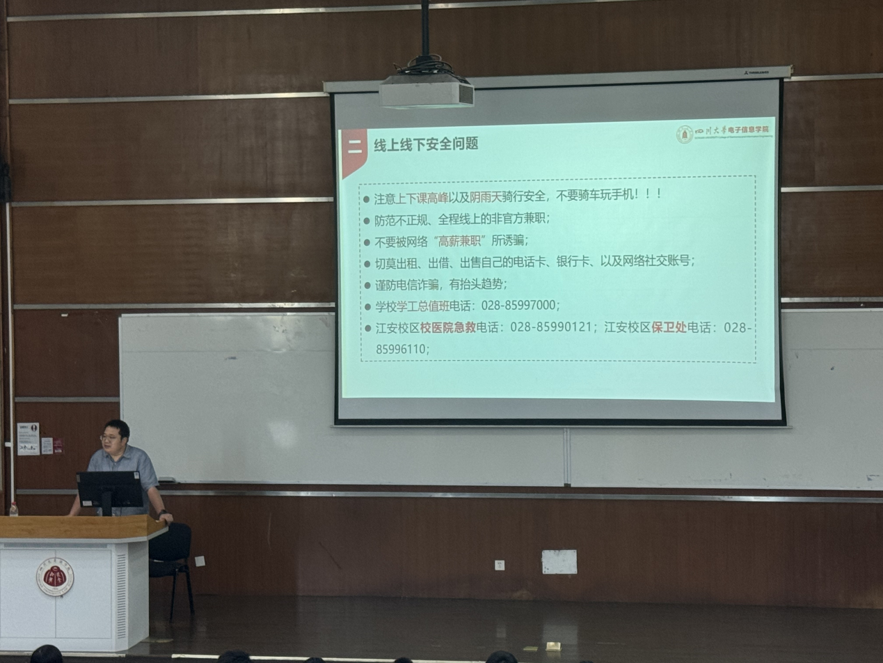 2024年9月20日,本科2023级9月年级大会在江安校区综合楼C407顺利召开。本次会议由辅导员申鑫老师主持,旨在总结过去一年的工作,部署新学年的重点任务,并就学生关心的综测、奖学金申请、安全问题等进行详细说明。