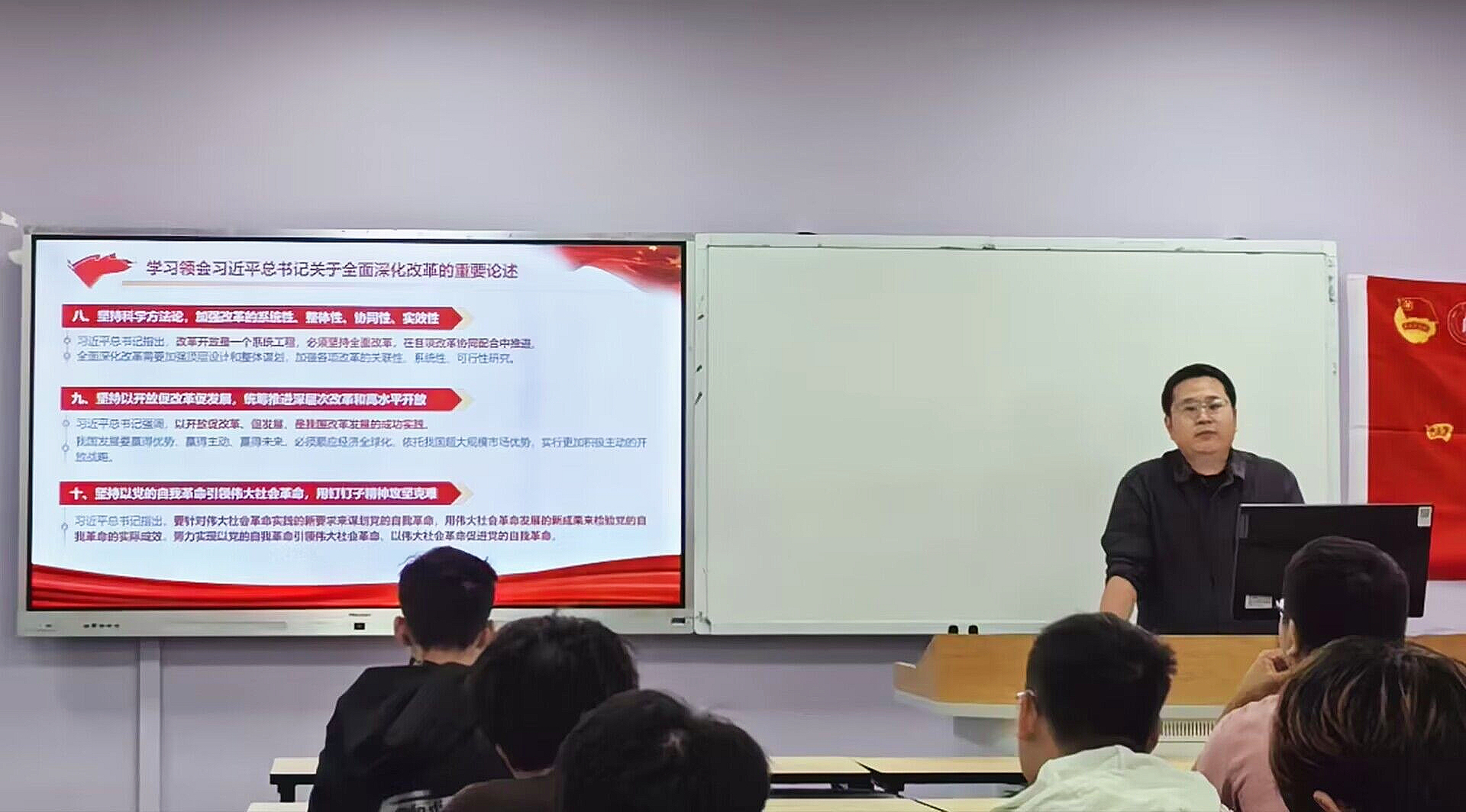 主讲人申鑫老师围绕党的二十届三中全会精神,分别从“深刻认识党的二十届三中全会的重大意义”、“学习领会习近平总书记关于全面深化改革的重要论述”、“准确把握进一步全面深化改革的总体要求”、“深入把握进一步全面深化改革的重点任务”这四个部分进行授课,阐明坚持中国共产党领导下的全面深化改革的重要性以及如何将全会精神转化为具体行动,内容充实、论述透彻、言辞生动。申鑫老师围绕党的二十届三中全会理论知识深化、实践应用指导及个人成长路径规划等多个层面对同学们提出的疑问进行了全面而细致的解答,并激励青年同学们在新时代的改革发展中发挥青春智慧和力量。