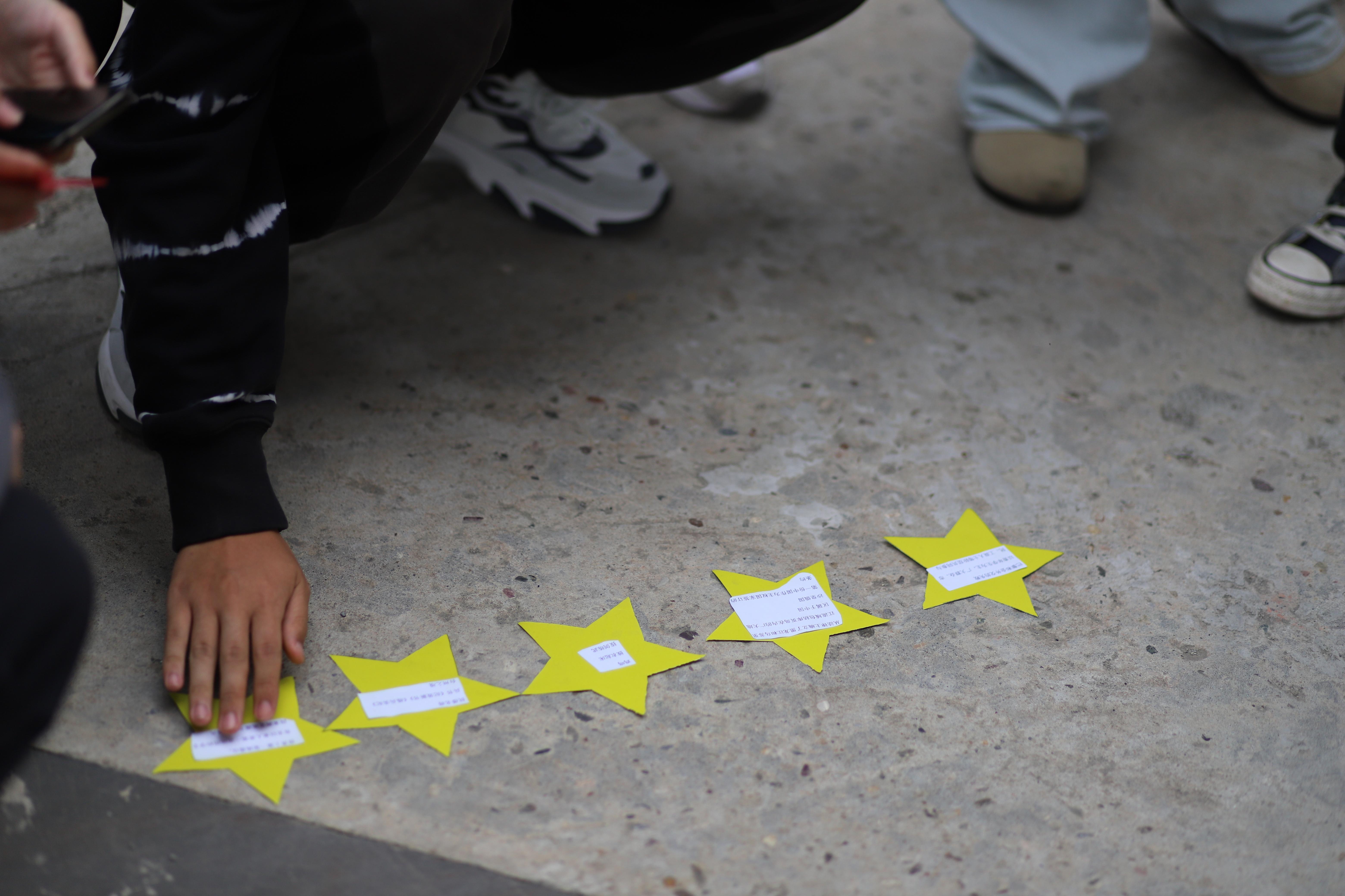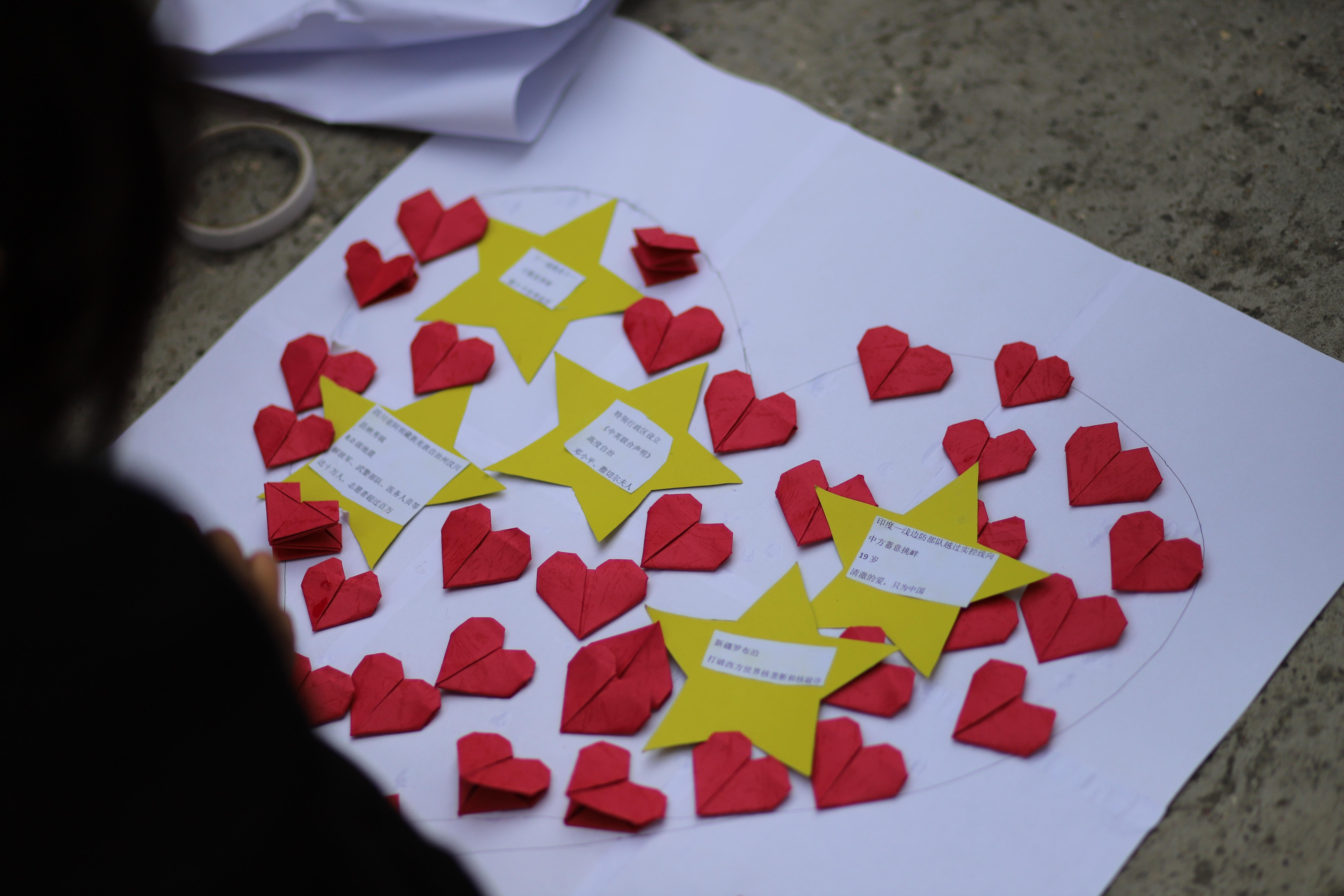 最后,在活动的尾声,每位同学通过折纸的方式,亲手制作红色爱心,并在最后将个人的爱心与寻宝过程中收集的黄色星星线拼贴到一张大纸上,汇聚成一个象征团结与力量的大爱心。这一环节让每位同学都感受到了团队的力量与爱的传递。