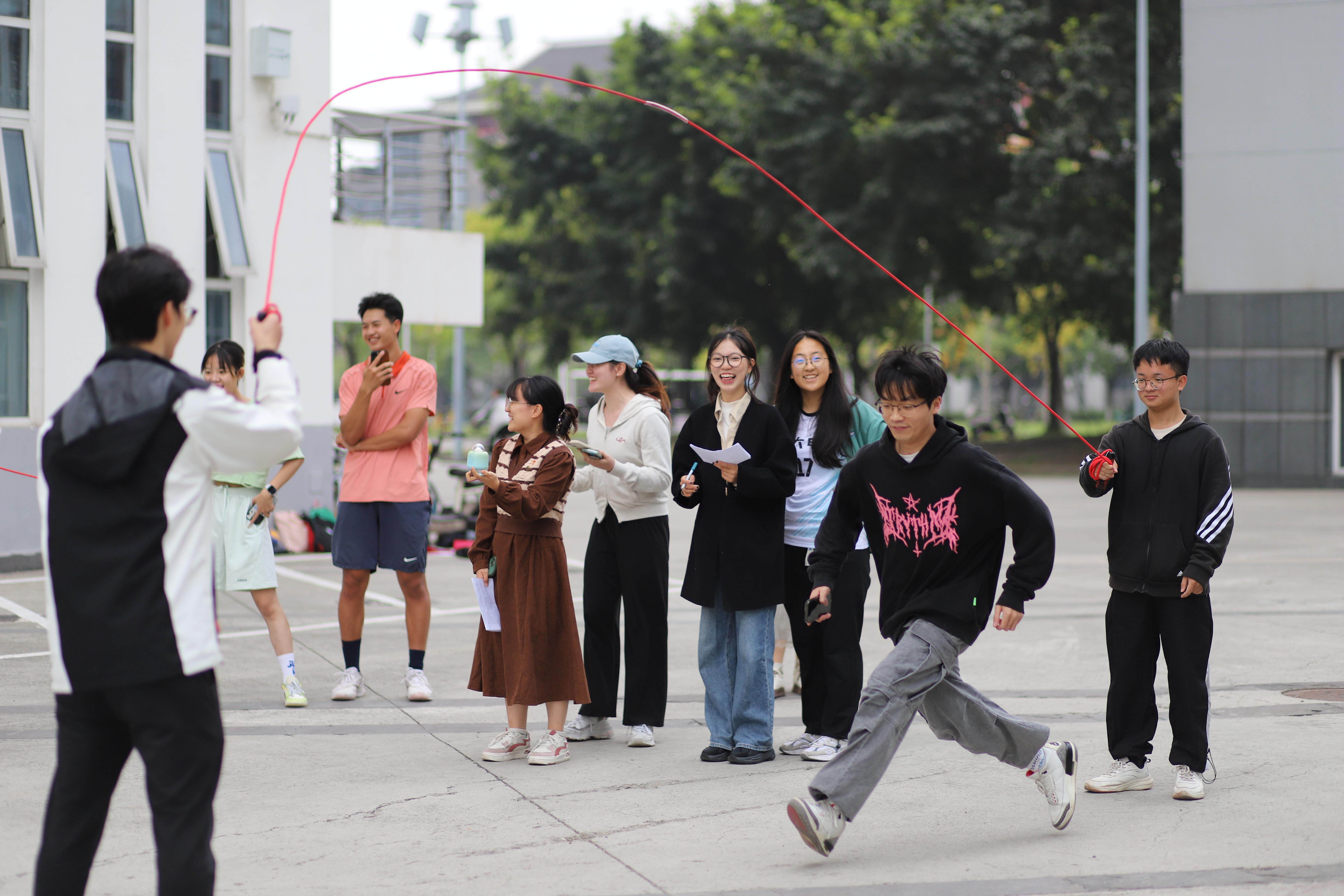 随后,活力与激情在活动中交织。我们将跳大绳与猜红歌相结合,迎面接力与红色知识竞答相结合,两所学院进行了激烈的PK竞赛。在运动中学习,在学习中感知爱国力量,欢声笑语不断响彻整个场地,充分展现了同学们的青春风采。