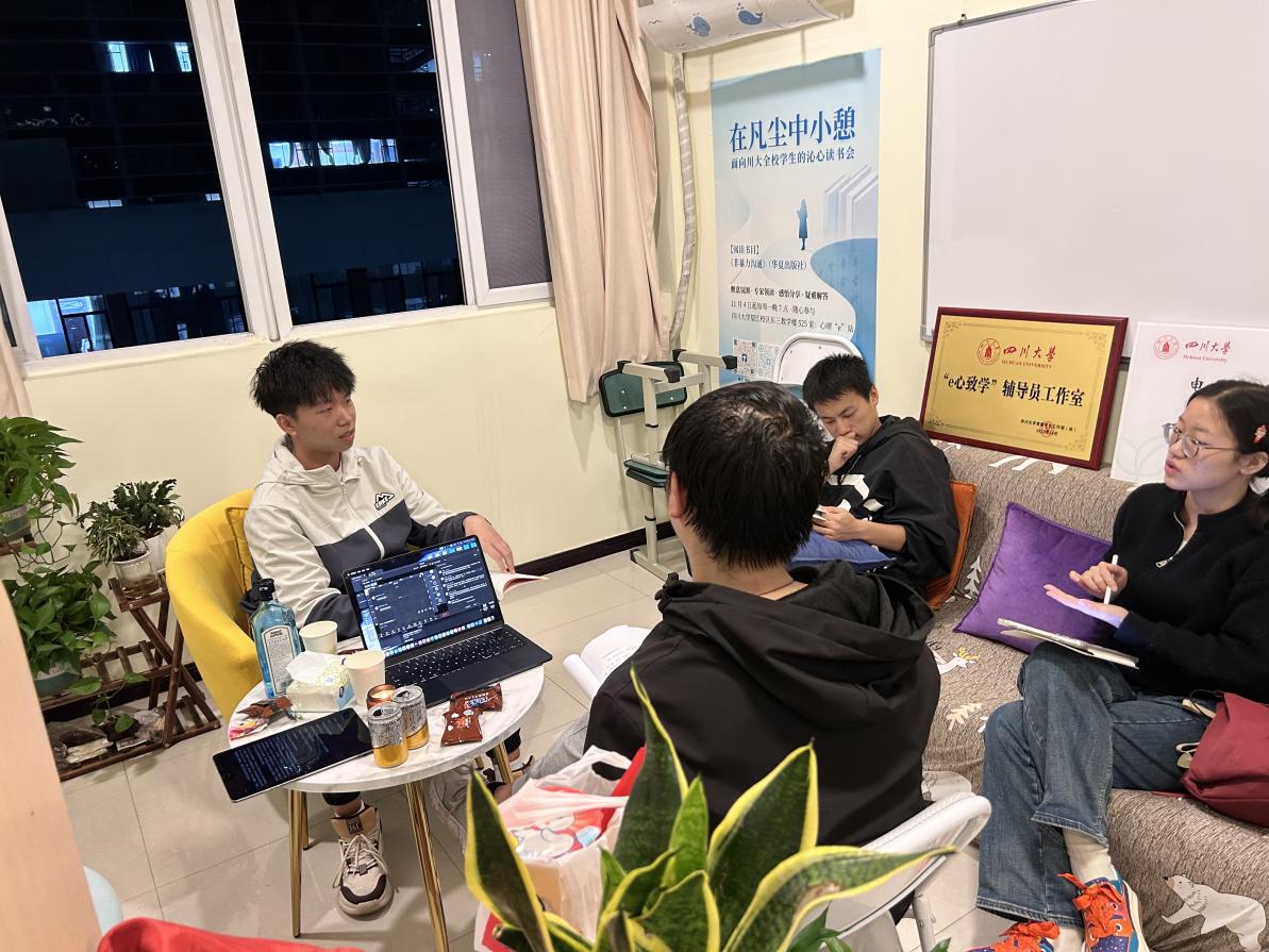 2024年11月11日下午7点,由四川大学yl23411永利(集团)有限公司官网主办、yl23411永利(集团)有限公司官网二级心理辅导站和四川大学“e心致学”辅导员工作室联合承办的“在凡尘中小憩”沁心读书会第二次活动在四川大学望江校区东三教学楼525室顺利举办。本次活动由何惠老师线上参与并指导,辅导站学生站长李岩峰领读,线上线下同时开展。