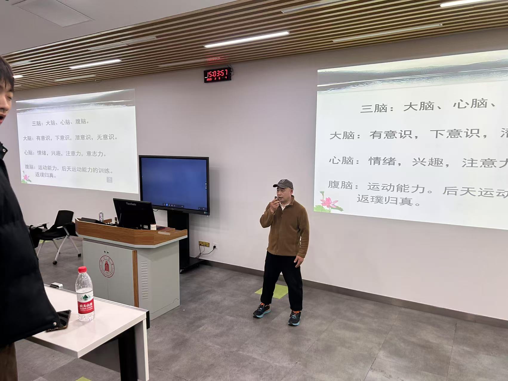 孙老师在讲座中详细阐述了“三脑”的概念和其相互关系。他指出,三脑包括大脑、心脑和腹脑,分别掌管意识、情绪与兴趣以及运动等功能。孙老师强调,通过科学理解三脑的作用,结合太极运动的训练方法,可以有效促进身体健康。