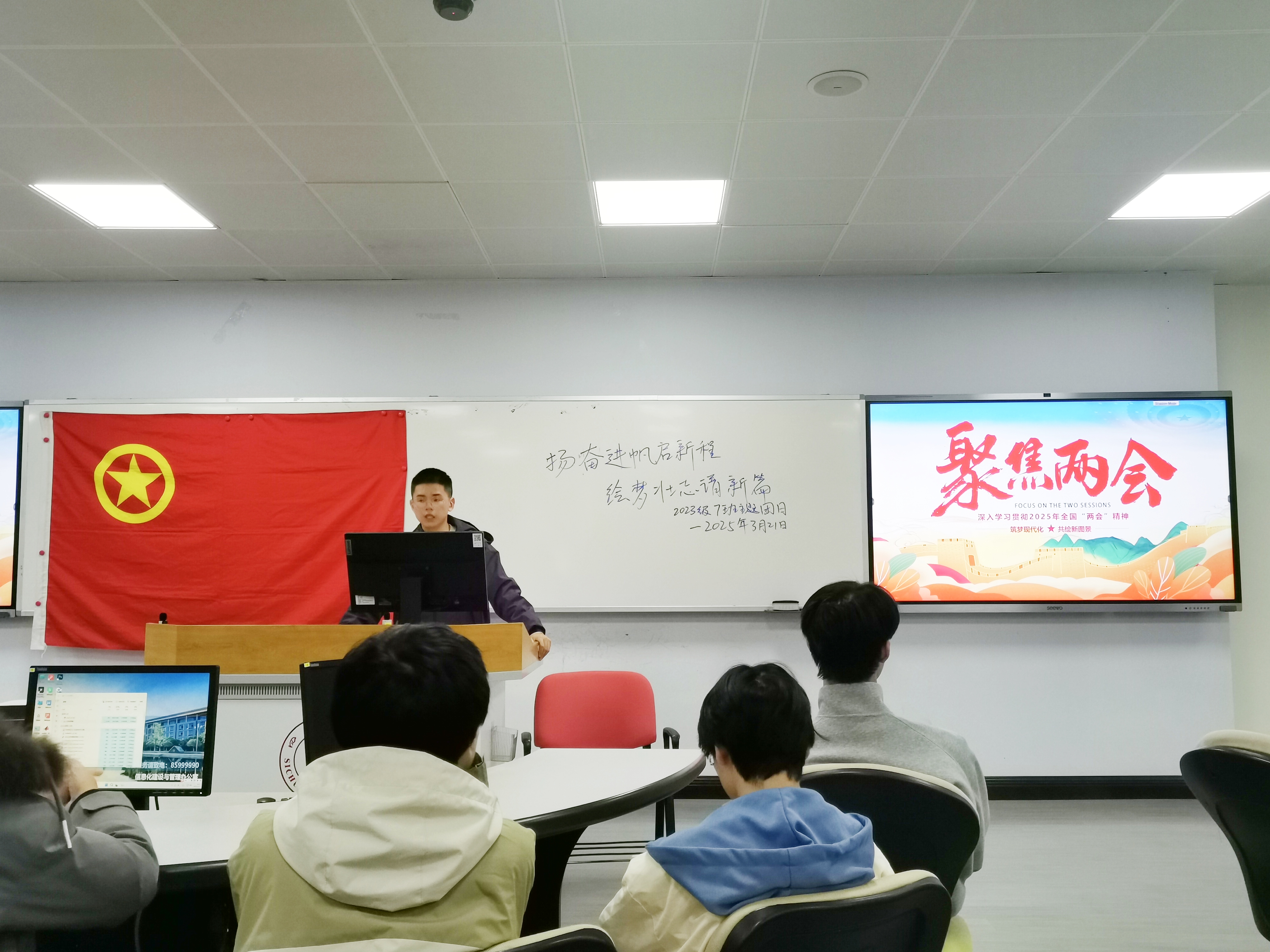 3月21日,理论学习环节在江安校区综合楼B座205室举行。活动伊始,团支书莫斌斌以“两会精神与青年使命”为主线,聚焦政府工作报告中经济转型、科技创新、民生保障等重点领域,结合“新质生产力”“高质量发展”等关键词,解析国家战略与青年成长的关联。