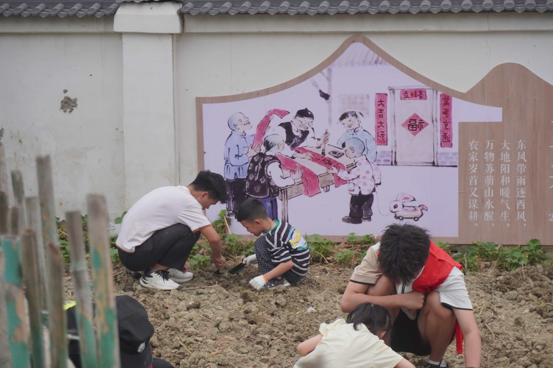 稻草人制作结束后,大朋友拉着小朋友的手来到了空港微菜园。在工作人员的指导下,大家按照“划线、定点”的方法一起播种花生、芋头种子。同学们耐心地向小朋友们传授技巧,小心翼翼地将种子放入土中,再轻轻覆盖上一层土。播种完毕后,大家插上了刚刚制作的稻草人来守护自己的土地,期待着丰收时节的到来。