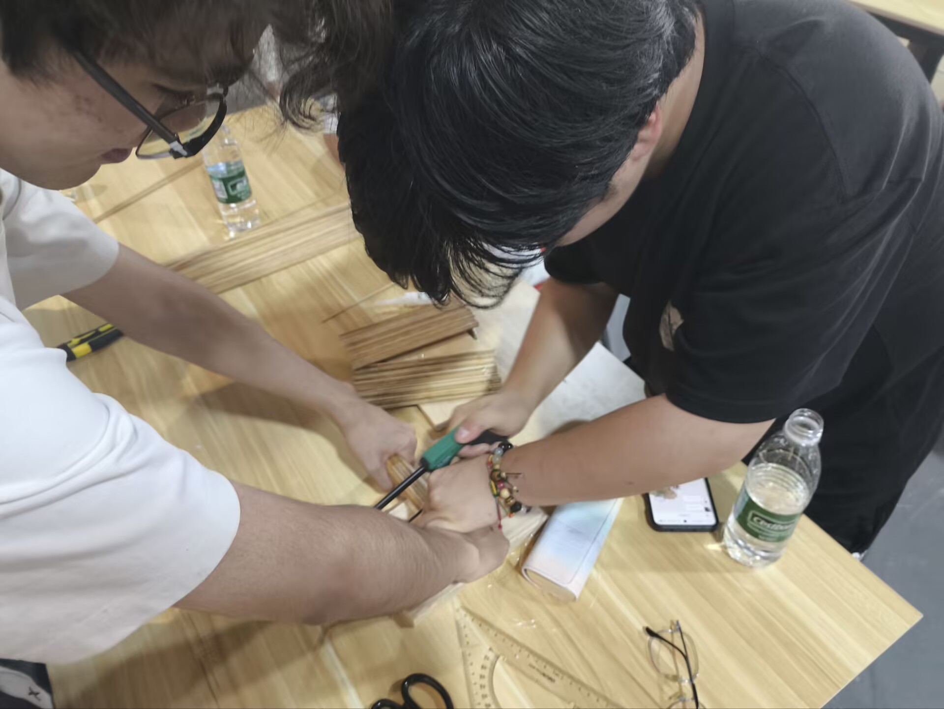 图为同学们切割打磨木材