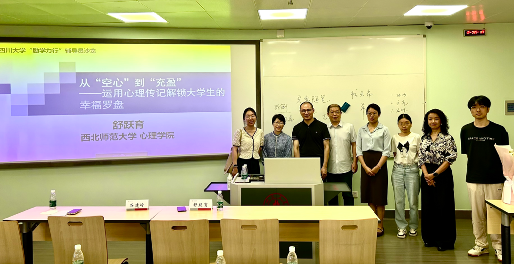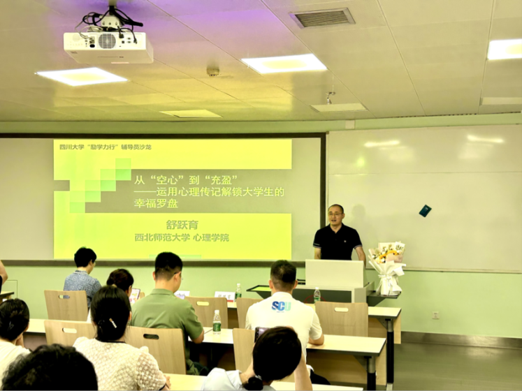 9月12日上午9:30至12:00,由四川大学党委学生工作部(处)指导,四川大学“e心致学”辅导员工作室与yl23411永利(集团)有限公司官网二级心理辅导站心晴“e”站联合主办的辅导员沙龙,在望江校区基础教学楼A504顺利开展。本次沙龙特邀西北师范大学心理学院舒跃育教授主讲,主题为“从‘空心’到‘充盈’:运用心理传记解锁大学生的幸福罗盘”,活动由何惠老师主持,70余名师生参与沙龙。