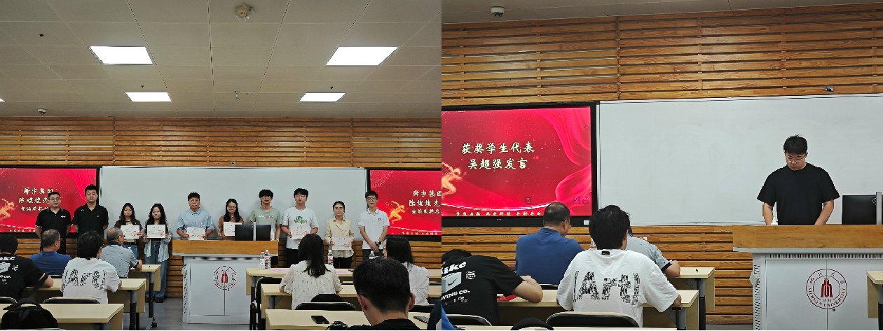 紧接着,陈课长宣布了2024年度“舜宇”奖学金获奖名单,到场嘉宾为获奖学生进行颁奖。获奖学生代表吴超强发言,表达了对导师及舜宇集团的感谢。