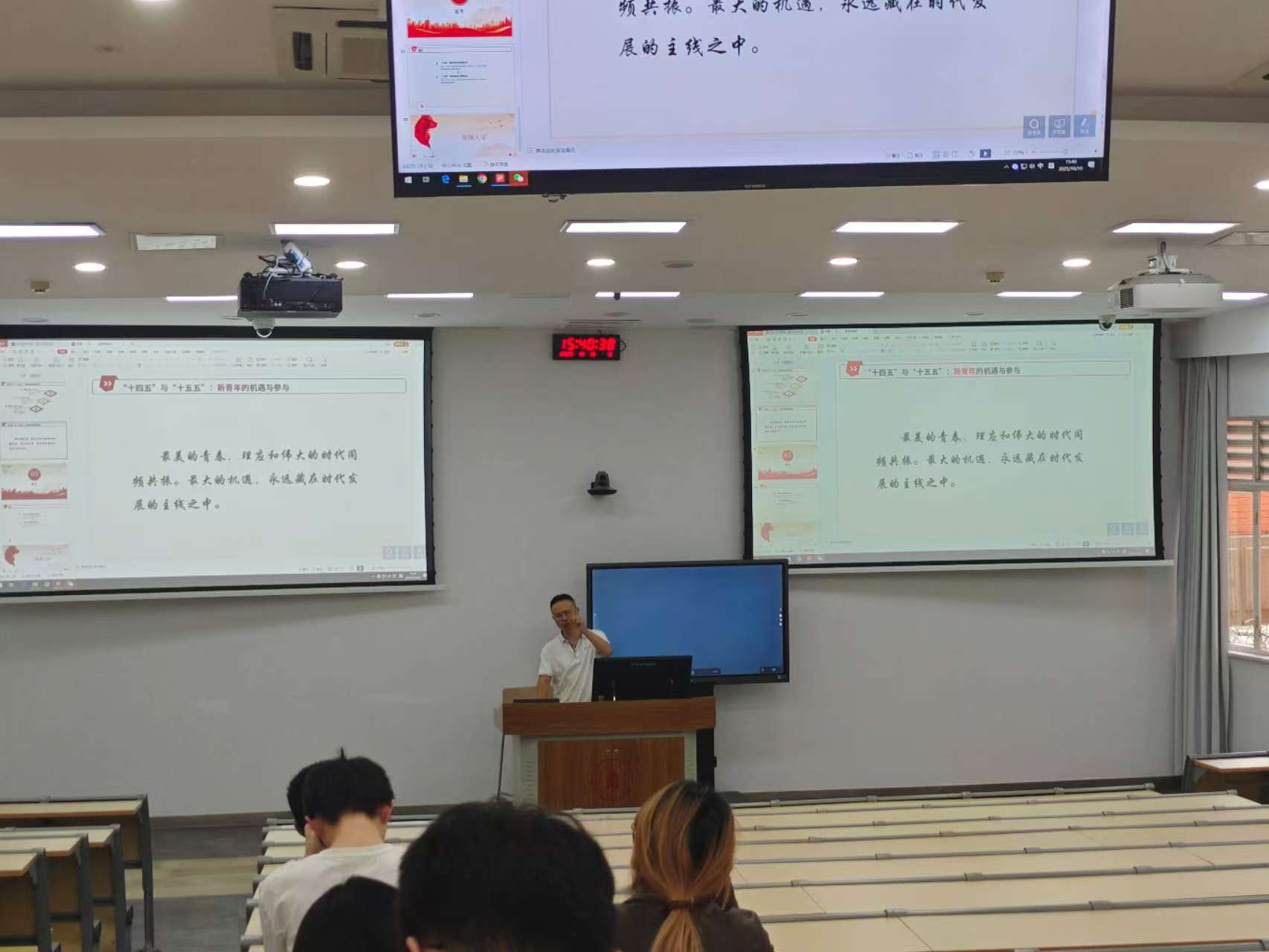 本次课程的主题是《决胜“十四五”,奋发向前行》,课上,谢老师以饱满的热情倾情演讲。他勉励同学们要坚定理想信念,将个人发展融入时代潮流;要主动探索自我,充分利用四川大学提供的丰富平台与优质资源,不断提升综合竞争力。他特别强调,大四是人生承前启后的关键阶段,务必珍惜宝贵时光,明确职业方向,以积极姿态把握青春机遇,奋力迈向自己真心热爱的行业,实现人生价值。
