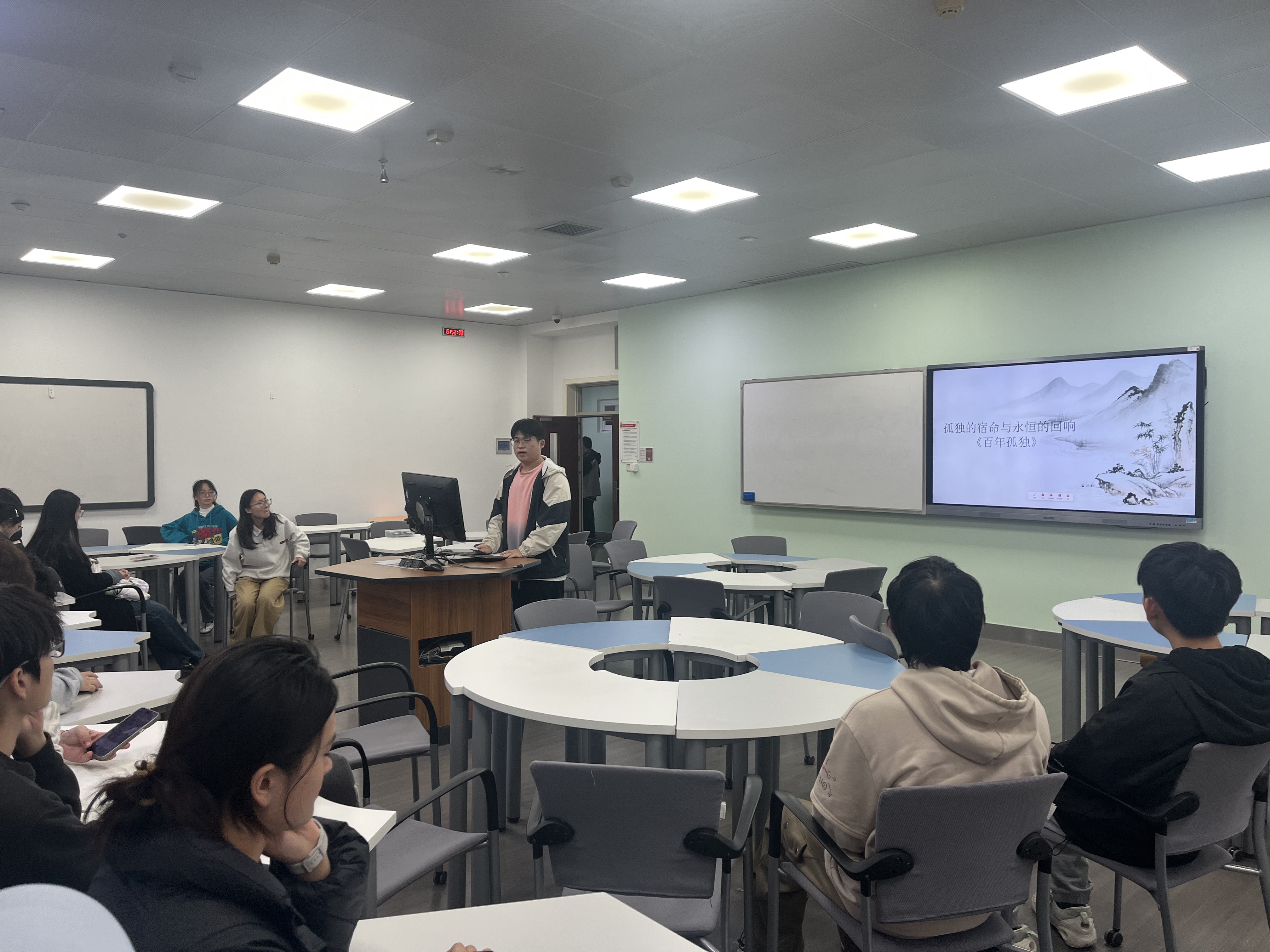 冯敬康同学聚焦魔幻现实主义经典《百年孤独》,从布恩迪亚家族七代人的命运循环切入,解读了马孔多从创世到消亡的史诗背后,拉丁美洲的历史沧桑与人类孤独的永恒命题。他通过分析“小金鱼”“羊皮卷”等象征意象,以及“生命中所有的灿烂,终要用寂寞偿还”等经典名句,引导团员们思考现代社会中“虚假连接”与精神孤独的困境,引发了大家对沟通与存在的深度探讨。