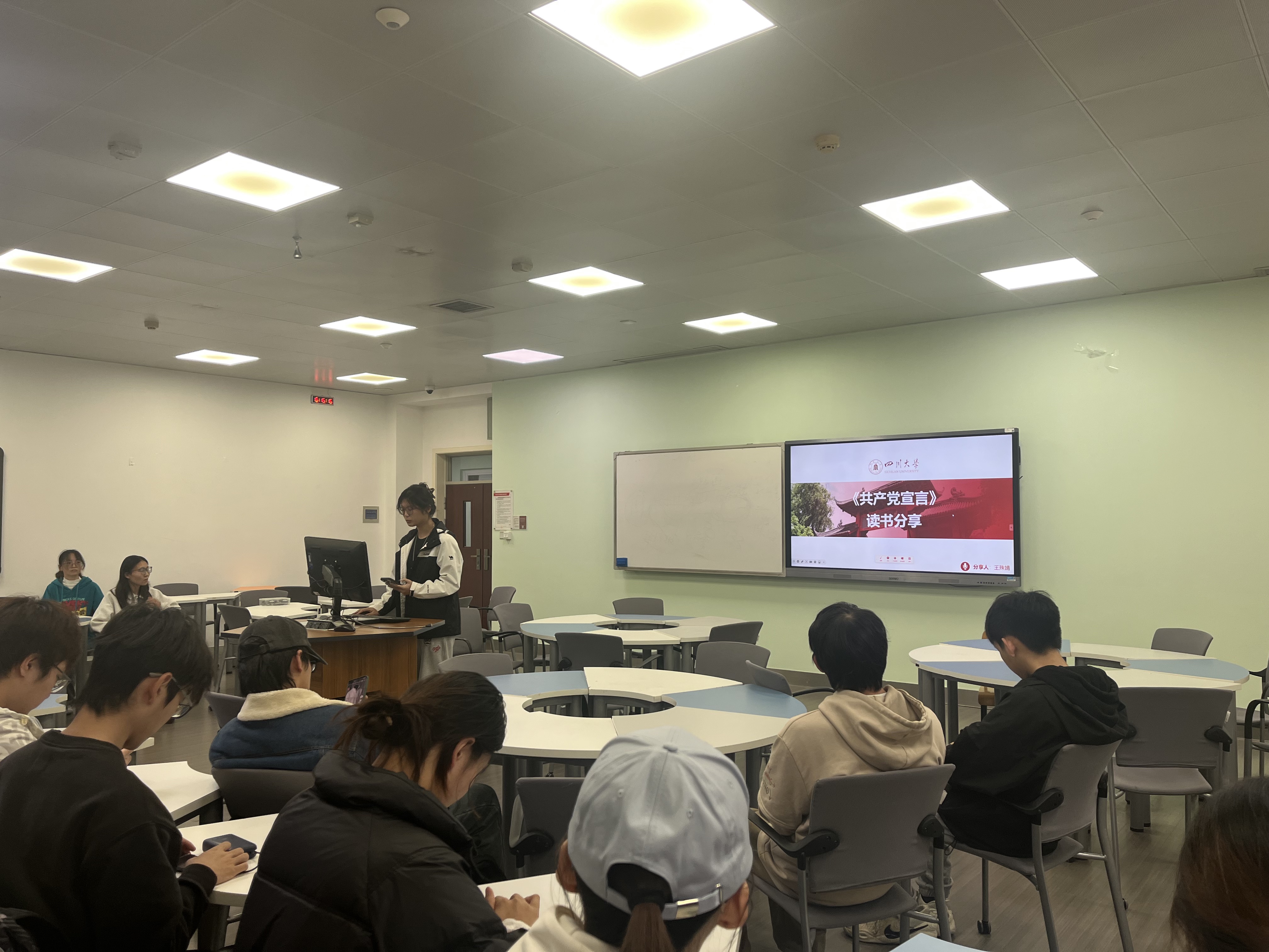 王殊婧同学以《共产党宣言》为核心,系统梳理了著作的创作背景——工业革命下资本主义矛盾的激化、无产阶级运动对科学理论的迫切需求,深入阐释了“一切社会的历史都是阶级斗争的历史”“全世界无产者,联合起来!”等核心思想,并结合“996”“内卷”等当代社会现象,剖析了著作跨越时空的现实启示,让团员们对科学社会主义理论有了更深刻的认知。