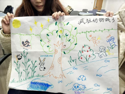 活动的第四部分为共同创作。在何惠老师的引导下,以徐嘉蔚同学为组长,大家拿起画笔,围绕“美好的动物家园”主题进行集体绘画创作。在创作过程中,大家充分发挥想象力与协作精神,在20分钟内默契配合,共同完成了一幅色彩斑斓、充满生机的作品,并为其赋予了一个充满趣味的标题——《疯狂动物城3》。创作结束,罗翔升同学作为代表,详细阐释了作品的构思、表现形式及其内涵。