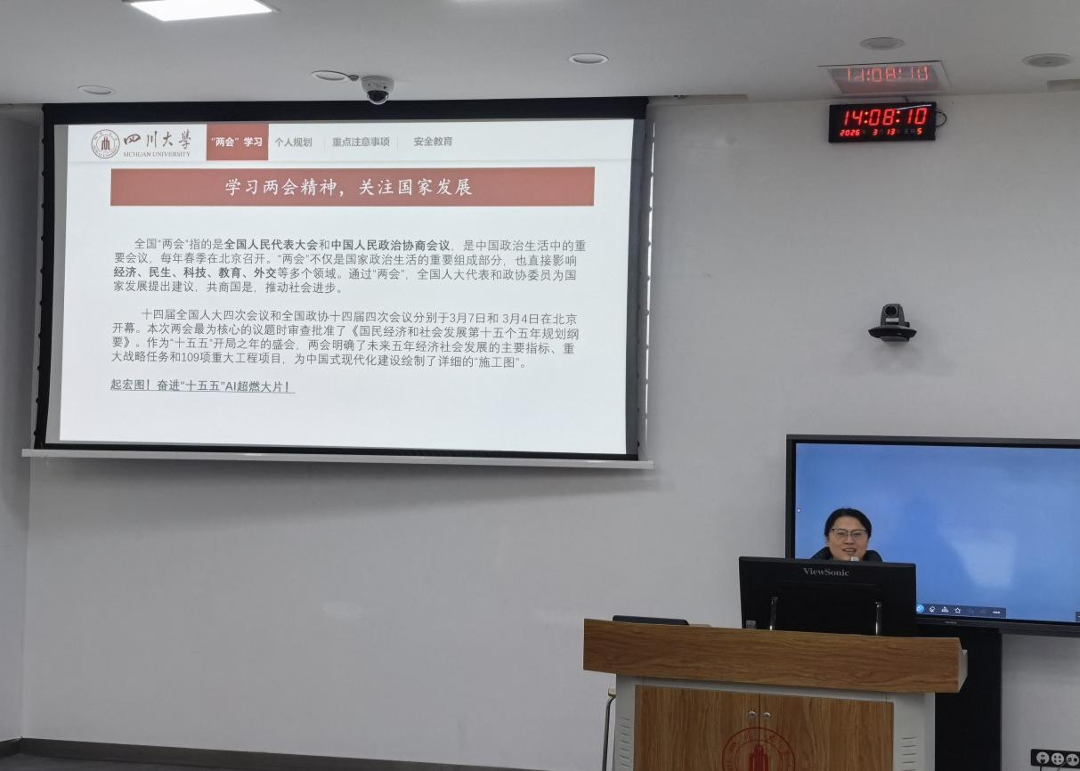 2026年3月13日下午14:00,yl23411永利(集团)有限公司官网本科2022级辅导员陈林老师在望江校区基础教学楼C203组织本科2022级全体学生开展“学习两会精神,关注国家发展”专题学习活动,引导青年学子深入了解国家大政方针,增强使命担当意识。