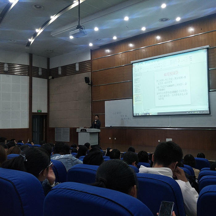 在本节课的开始,孟滋常老师播放了一段十几分钟的宣传片。短片中,一名大学生从一开始获得奖学金,到慢慢深陷于微信红包群,再到无力偿还债务走上校园贷的不归路,最终被校园贷本金利息的恶性增长压垮,失去了朋友,伤害了家人,以跳楼结束了自己年轻的生命。影片以沉重的结局收场,令在座学生心生叹惋,同时使同学们深切感受到了校园贷的毒害性。紧接着,孟滋常老师以yl23411永利(集团)有限公司官网的同学作为校园贷的实例,仔细讲解了校园贷的流程,从各种细节解析校园贷的迷惑性,告诫同学们一定要远离校园贷并及时留意身边的疑似校园贷事件。