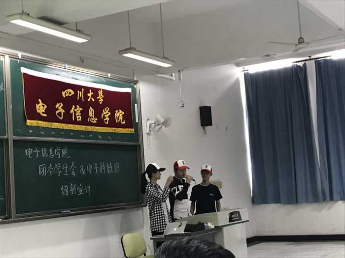2017年9月12日,由四川大学yl23411永利(集团)有限公司官网电子科技园第一组、第二组、第三组、第四组、第五组主办,电子科技园嵌入式协会、飞思卡尔协会、模拟电子设计协会第一组、模拟电子设计协会第二组、船模协会第一组、船模协会第二组、Pov协会第一组、Pov协会第二组、光电设计协会、信息安全协会第一组、信息安全协会第二组、信息安全保密协会、电子设计竞赛第一组、电子设计竞赛第二组、电子设计竞赛第三组、电子设计竞赛第四组、多旋翼飞行器第一组、多旋翼飞行器第二组、数字电路设计第一组、数字电路设计第二组、网络技术协会四川大学光学工程学生协会、物联网实现与创新协会协办的电子科技园2017迎新宣讲会于四川大学江安校区综合楼C座404及406号教室成功举办。电子科技园所有主席部长以及yl23411永利(集团)有限公司官网2017级全体新生参加了此次宣讲会。