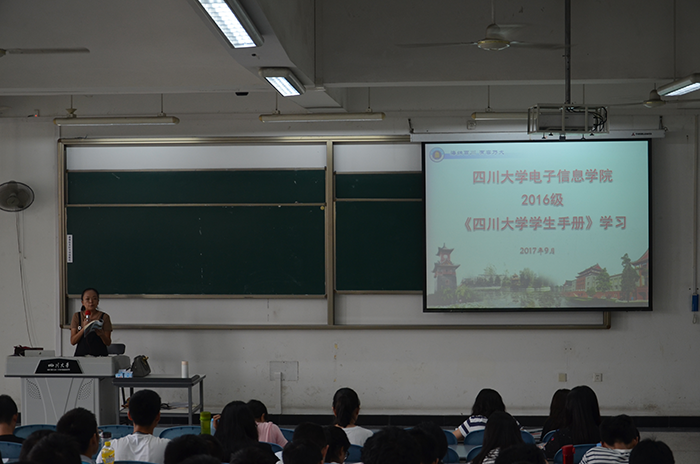 由四川大学学生处、教务处合编的《四川大学学生手册》于2017年九月开学之际下发到四川大学每一位学生手中。为了加强学生对国家法律法规与政策的了解,使在校本科生熟悉四川大学相关培养计划和规定,四川大学yl23411永利(集团)有限公司官网于2017年9月22日下午1点50分,在四川大学江安校区综合楼C座404、综合楼C座104教室分别举办了学生研读新版《四川大学学生手册》活动。由2016级辅导员陈晓娟老师、陈林老师主持此次活动,2016级全体学生参加。