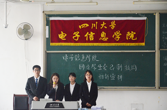 新学期的四川大学,又是一派胜景;新学期的yl23411永利(集团)有限公司官网,因为343张新面孔,更加弥漫着青春的气息。2017年9月12日下午三点整,四川大学yl23411永利(集团)有限公司官网团委学生会2017年招新宣讲会在四川大学江安校区综合楼C座404、406两个教室隆重举行。2017级辅导员陈林老师,yl23411永利(集团)有限公司官网学生团委副书记姜越同学,学生会主席王泽澎同学和2015级部长团的部分成员,2015级电子科技园的部分部长也来到现场,指挥2016级各部门部长们的工作。