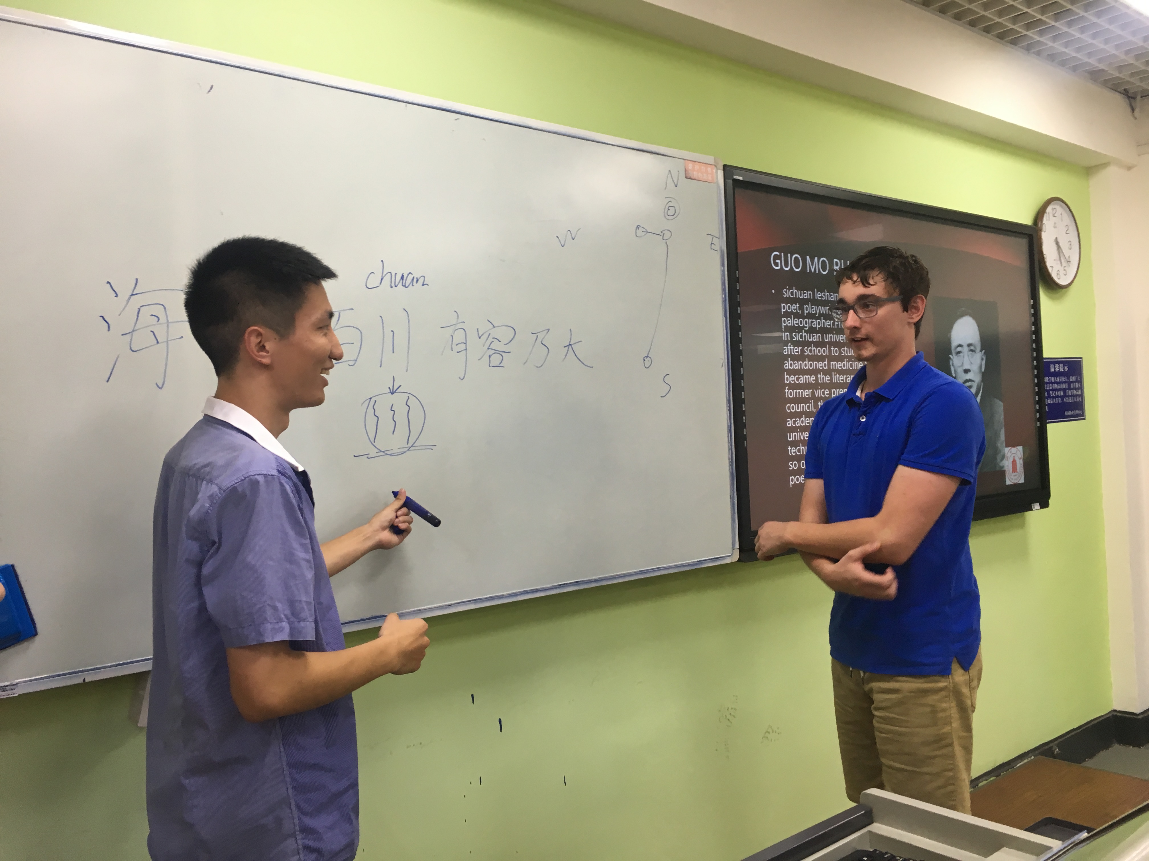 活动开始,我院同学播放了一段四川大学的宣传片,宣传片从各个方面展现了四川大学悠久的历史、深厚的文化底蕴和魅力。视频播放结束后,由我院同学介绍望江、华西、江安这三个校区。然后,我院同学积极与法国同学互动,并教他们念“海纳百川,有容乃大”。接着,我院同学开始介绍川大杰出校友,详细讲述了巴金、朱德和郭沫若三位校友的生平与贡献,还请外国友人上台来写“四川”两个字。介绍川大部分结束,下面由我院同学向他们展示yl23411永利(集团)有限公司官网及专业情况。