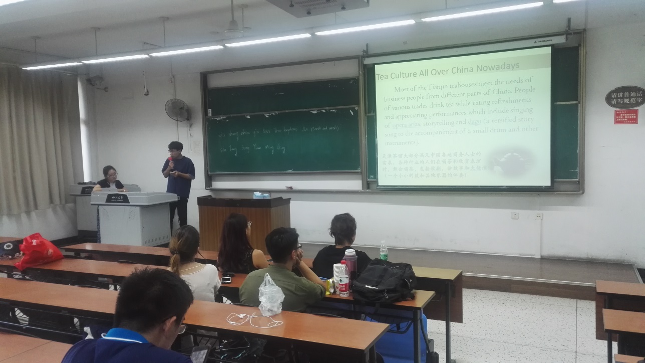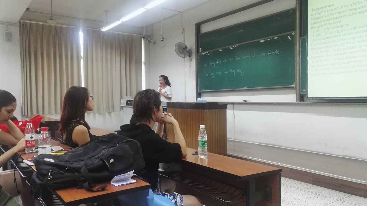 当日下午14时,交流营的学生全员到齐之后,组长简明扼要地对今天的行程做了介绍后,同学们就开始了文化展示。首先,由川大的同学利用ppt和视频,从茶的起源和早期发展,当代茶文化,功夫茶中的物理和化学因素,茶的制作过程等方面进行了展示,同学们在台上慷慨激昂,从炎黄部落讲到唐宋明清,再从明国初年讲到现当代。台下的同学们也聚精会神地听讲,徜徉在茶文化的浮光掠影之中。