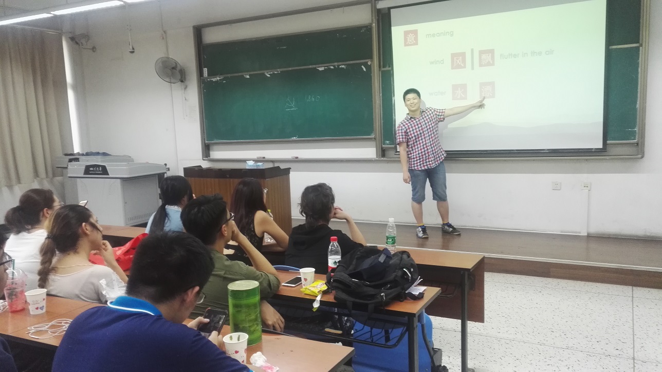 当日下午6点,大家来到第一基础教学楼B103,在川大同学介绍中国茶文化结束后,由中科大的卢傲然同学介绍中科大的有关情况和中国汉字文化。