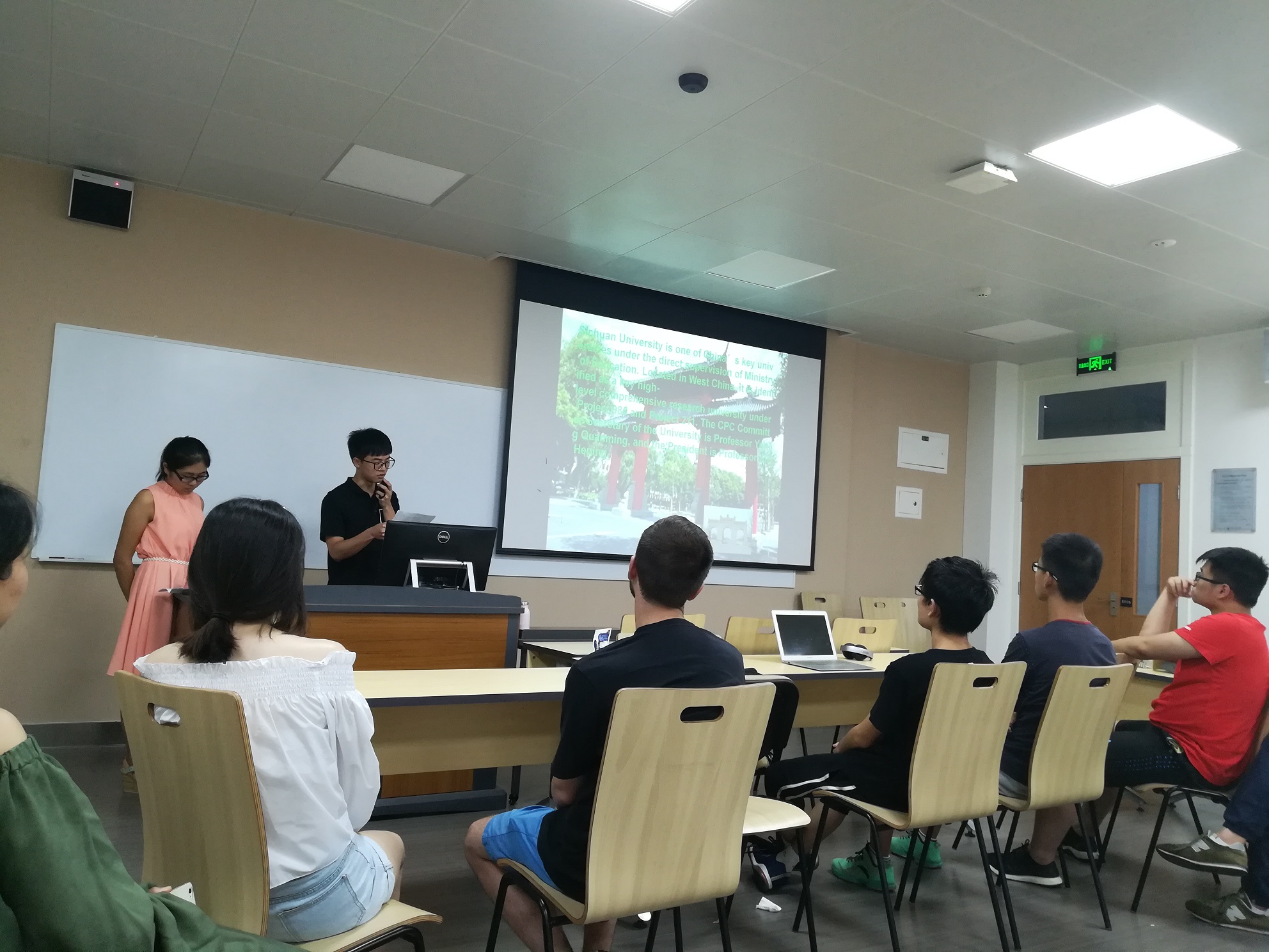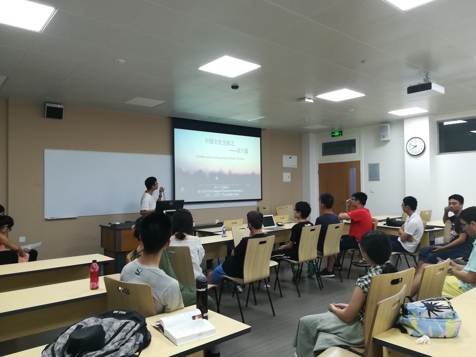 交流会于下七点在四川大学江安校区第一基础教学楼A109正式开始,由四川大学yl23411永利(集团)有限公司官网刘姝廷同学担任此次活动主持人。会前为活跃气氛,同学们围坐在教室中央一起玩了一个报数的小游戏,在一片欢声笑语中,交流会拉开了序幕。首先由四川大学电子信息的肖语奇同学为大家介绍巴蜀文化,美味的川菜、可爱的国宝大熊猫、精彩绝伦的川剧、诙谐幽默的四川方言,无一不引起大家对多彩四川文化兴趣;接下来由四川大学yl23411永利(集团)有限公司官网学生徐佳朗同学为大家介绍了四川大学的历史,加深了同学们对川大120周年历史的了解;最后,王洁同学从川大美景、美食、建筑三个方面,向大家展示了川大的秀美风光、一流的教学设施以及川大学子丰富多彩的校园生活。交流会后,为增进中外同学友谊以及川大学子与外校学生间的友谊,大家围坐在一起玩了小游戏,在依依不舍之中,第一次文化交流活动正式结束。
