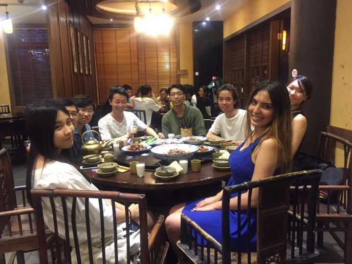 晚八点,一行十七人来到了井巷子边的市井生活馆就餐,用一顿饭的时间介绍了中国的饭桌文化,餐桌上经典的川菜也让两位外国同学大饱口福,麻辣兔丁、宫保鸡丁、毛血旺、红烧肘子……每一道菜都有着自己的故事和独特的味道。