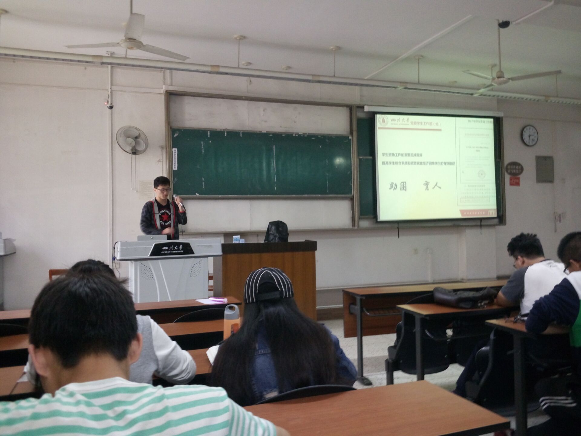 4月28日下午2点30分,yl23411永利(集团)有限公司官网2015级在江安一教B101开展“诚信资助”为主题的宣讲活动。阳光资助宣传员张嘉伦为同学们讲解。讲解分为四个部分:1.勤工助学的诚信问题;2.奖助学金评定中的诚信问题;3.大学生以及社会中的征信问题;4.调查问卷的填写与收取。
